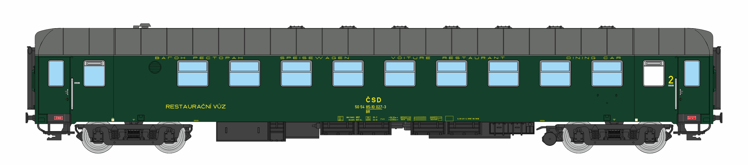 | restaurační vůz zelený s šedou střechou 2. tř., Ústí n. L. |