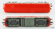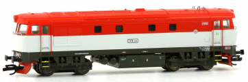 | dieselová lokomotiva červená-bílá, tmavě šedý rám a pojezd |