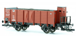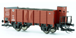 | otevřený nákladní vůz červenohnědý s brzdařskou budkou ložený uhlím |