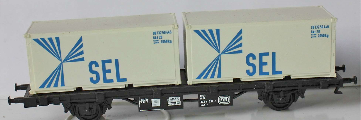 | plošinový nákladní vůz černý se dvěma 20' kontejnery „SEL“ |