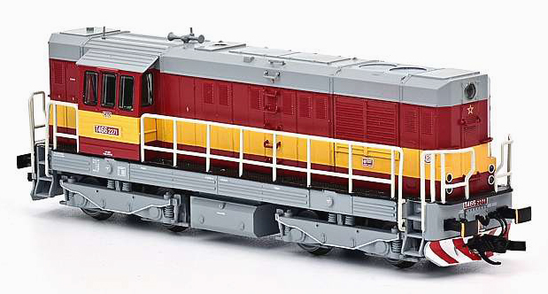 | dieselová lokomotiva červená s výstražným pruhem, šedá střecha, rám a pojezd |