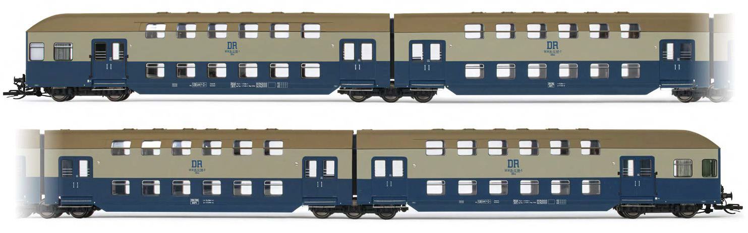 | čtyřdílná patrová jednotka modrá-světle šedá s olivovou střechou „S-Bahn Rostock“ |