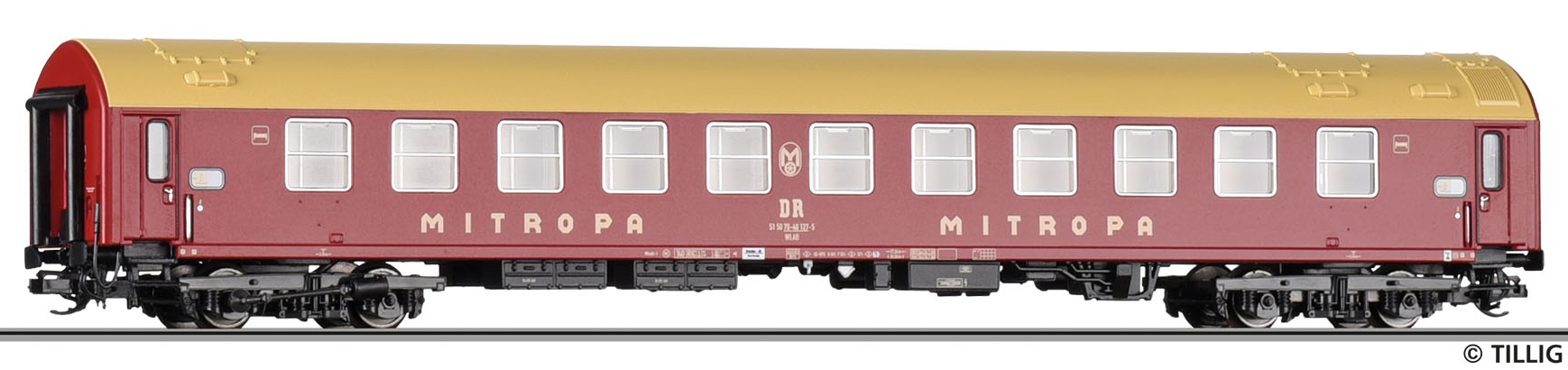 | lůžkový vůz vínově červený s olivovou střechou „MITROPA“ |