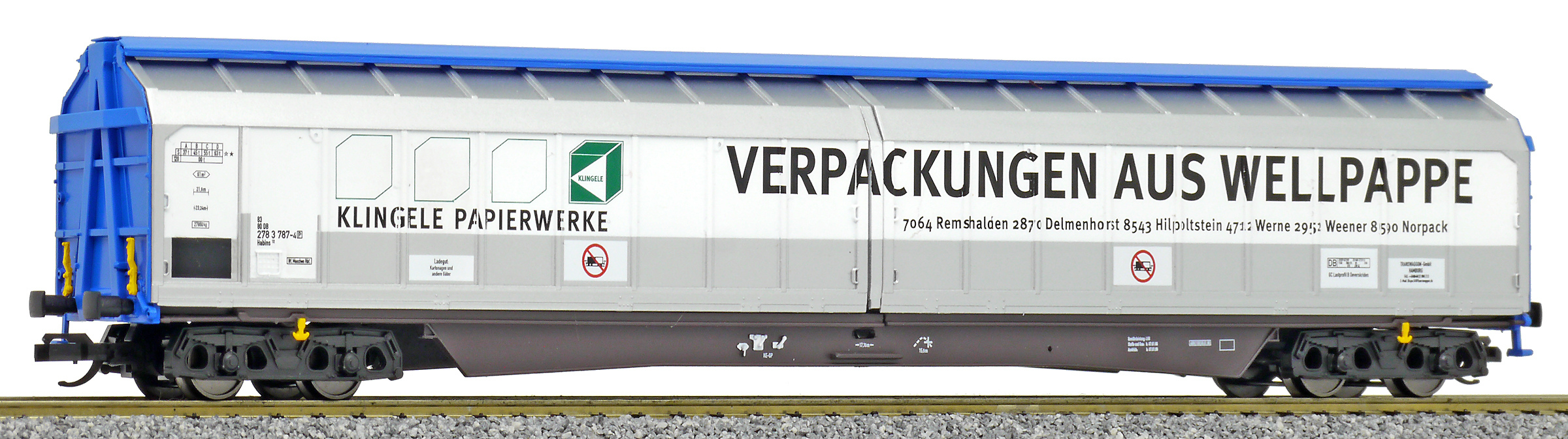 | nákladní vůz modrý s posuvnými bočnicemi „Klingele Papierwerke“ |