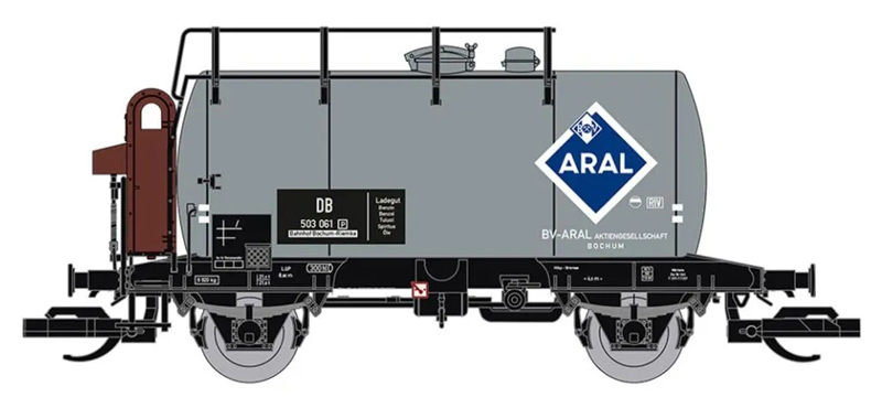 kotlový vůz šedý s brzdařskou budkou a s logem „ARAL“