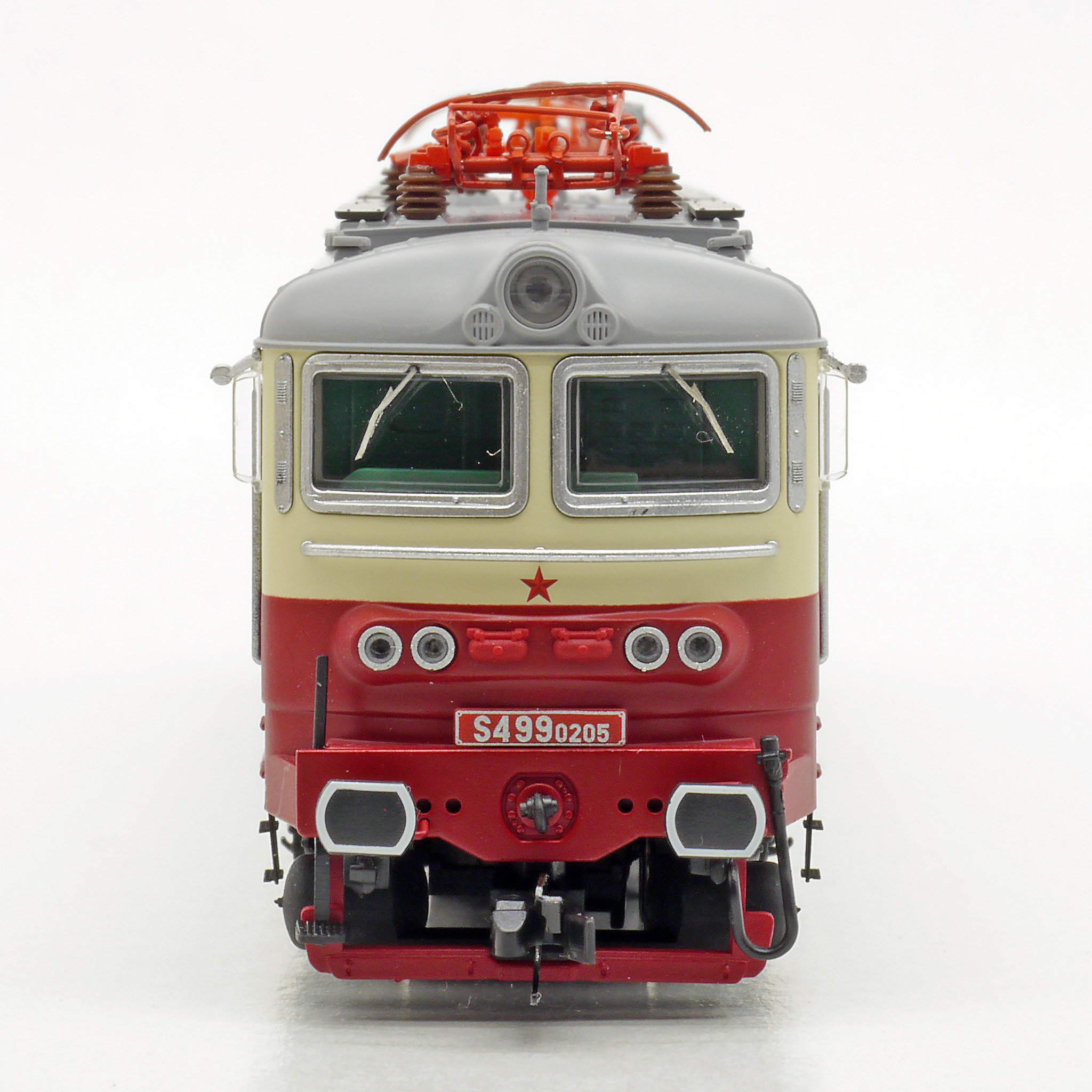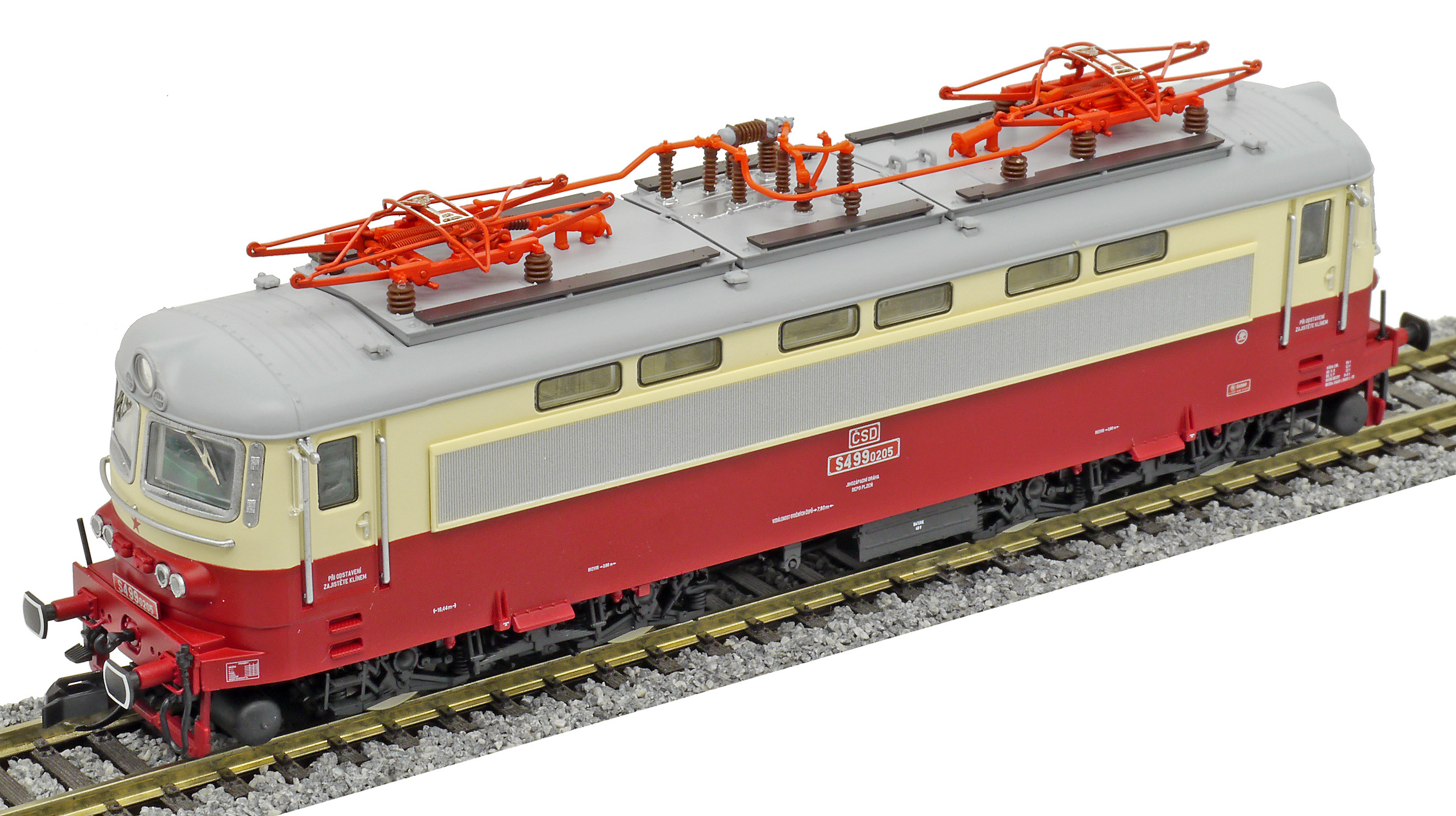 Popis   elektrická lokomotiva červená-slonová kost, šedá střecha a červené pantografy