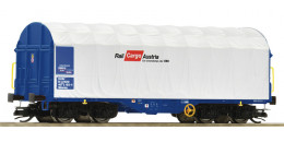 | plošinový vůz modrý s odsuvnou šedou plachtou „Rail Cargo Austria“ |