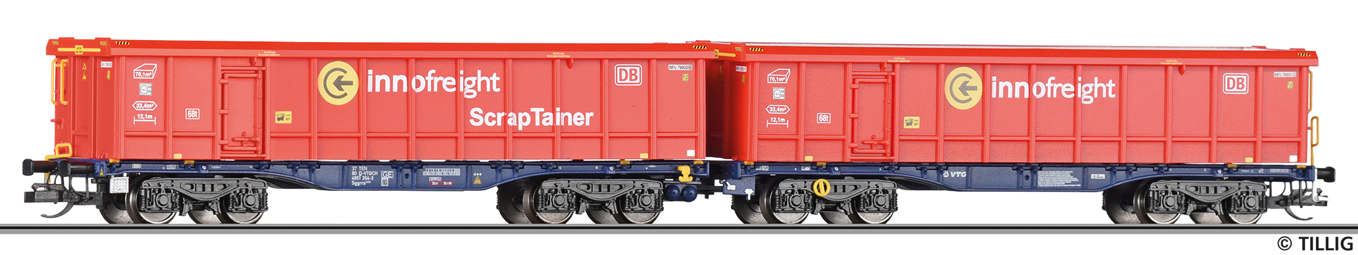 dvojitý nákladní vůz InnoWaggon 2x40' s nákladem dvou kontejnerů „ScrapTainer“