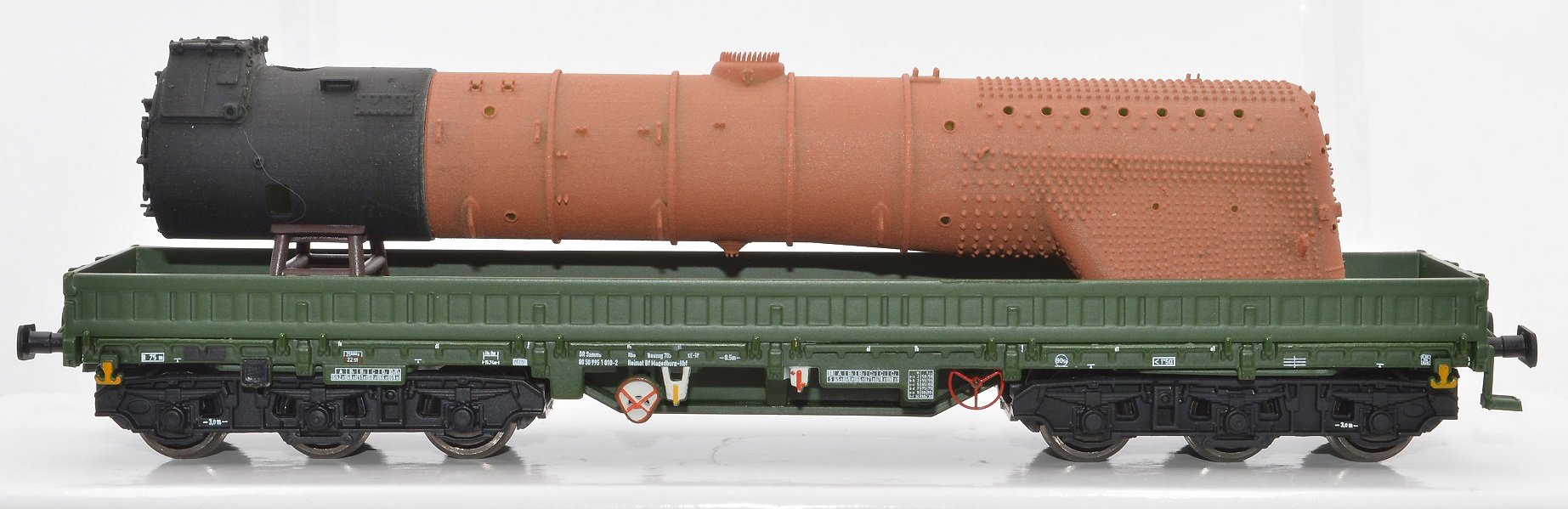 | nízkostěnný nákladní vůz zelený do pracovního vlaku s nákladem kotle lokomotivy BR 41 |