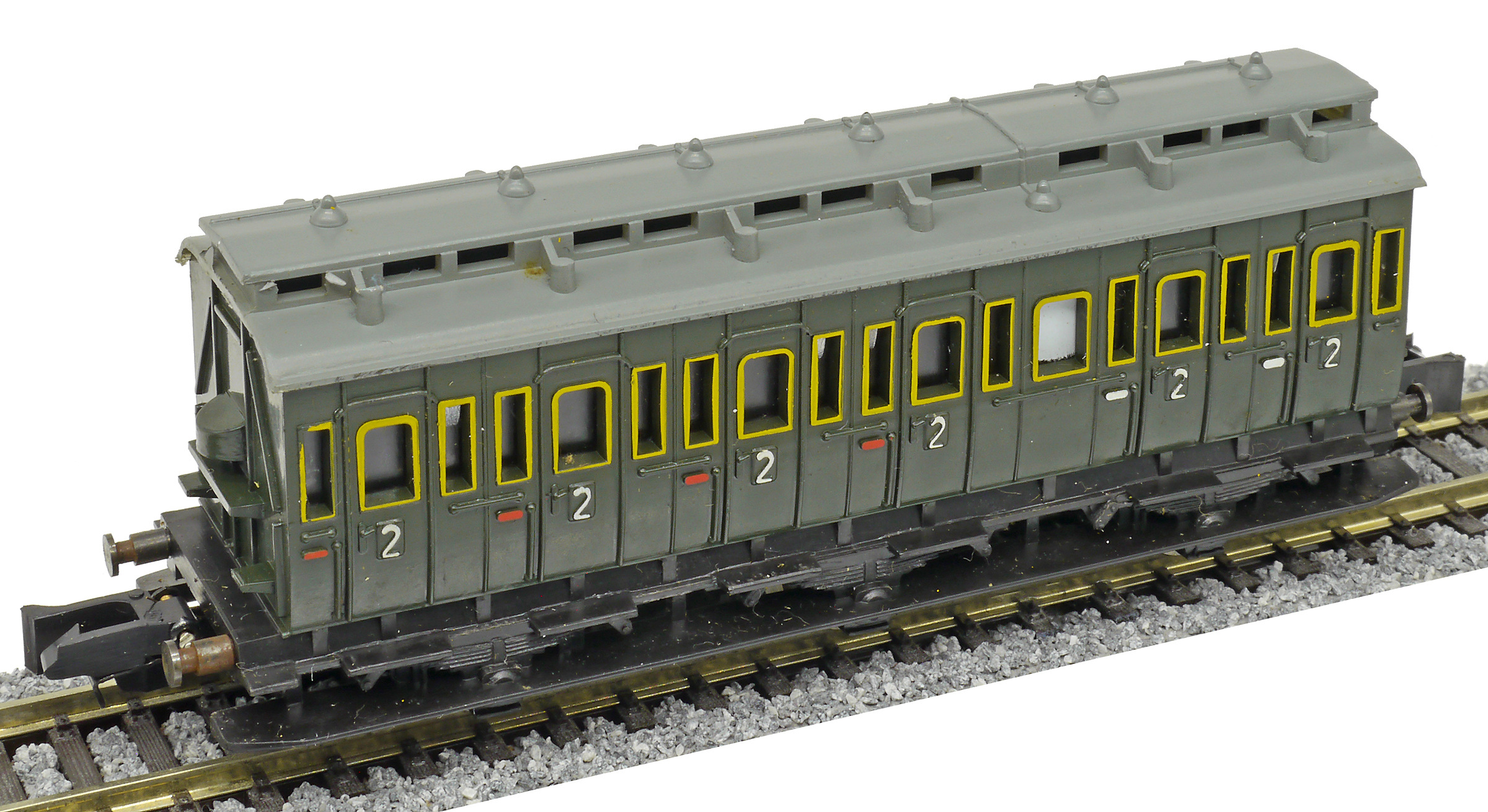 oddílový osobní vůz zelený s šedou střechou 2. tř.