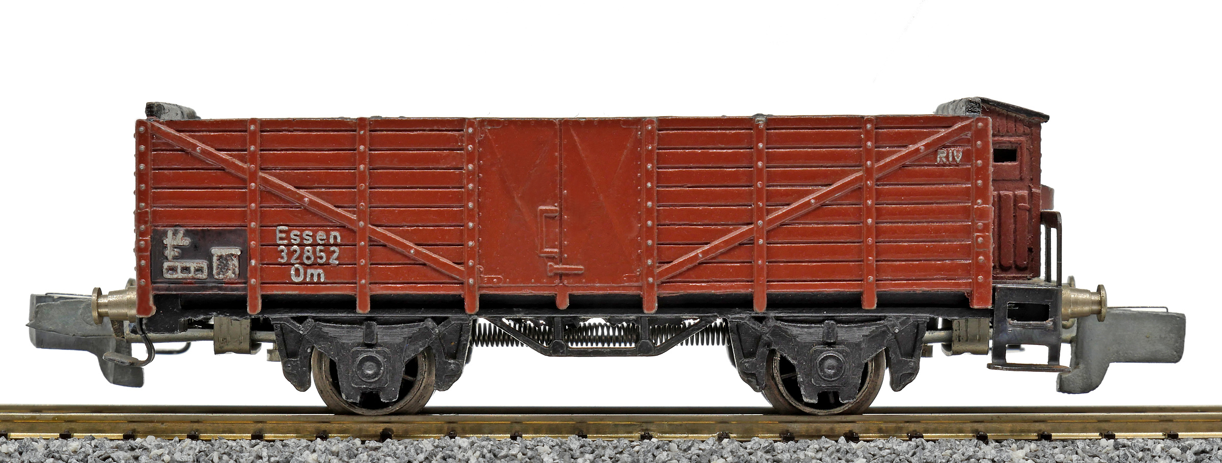 otevřený nákladní vůz červenohnědý s brzdařskou budkou ložený uhlím