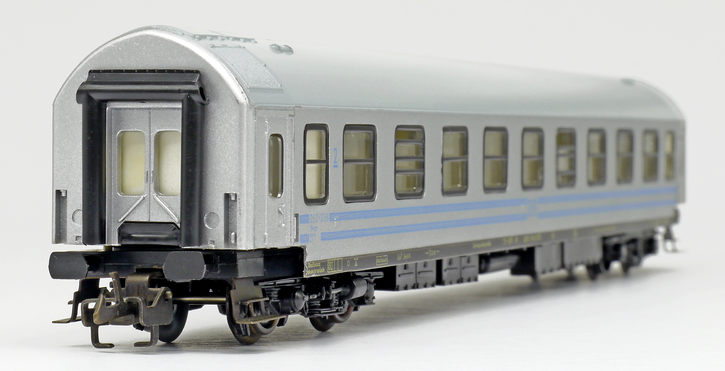 | rychlíkový vůz stříbrný se dvěma modrými proužky a s šedou střechou 2. tř. |
