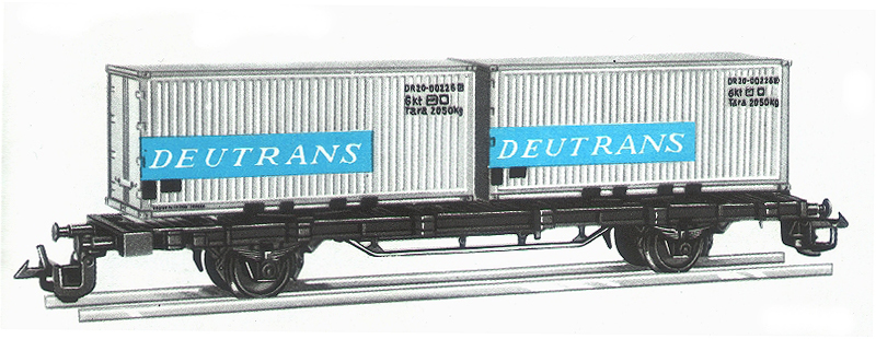 | nákladní plošinový vůz černý se dvěma 20' kontejnery „DEUTRANS“, později „DDR-CONT“ |