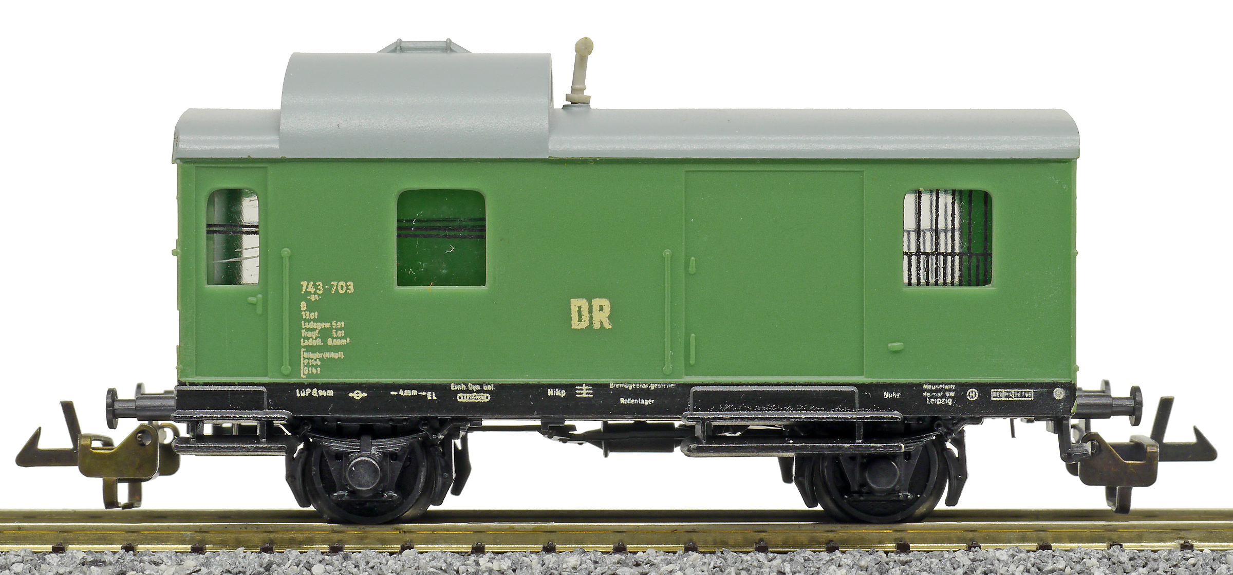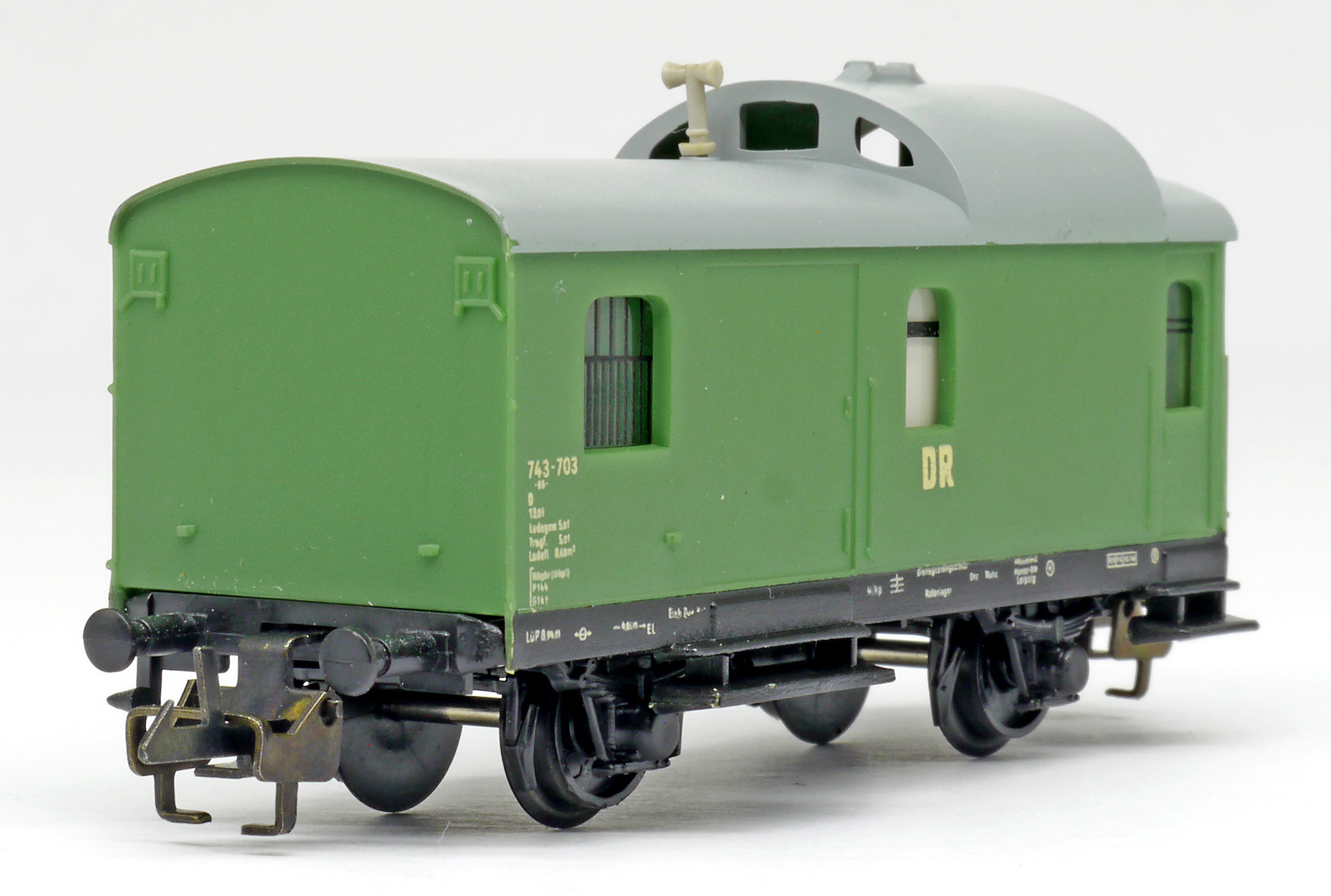 | služební vůz pro nákladní vlaky zelený s šedou střechou |