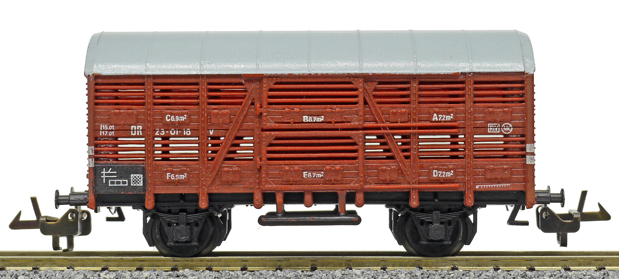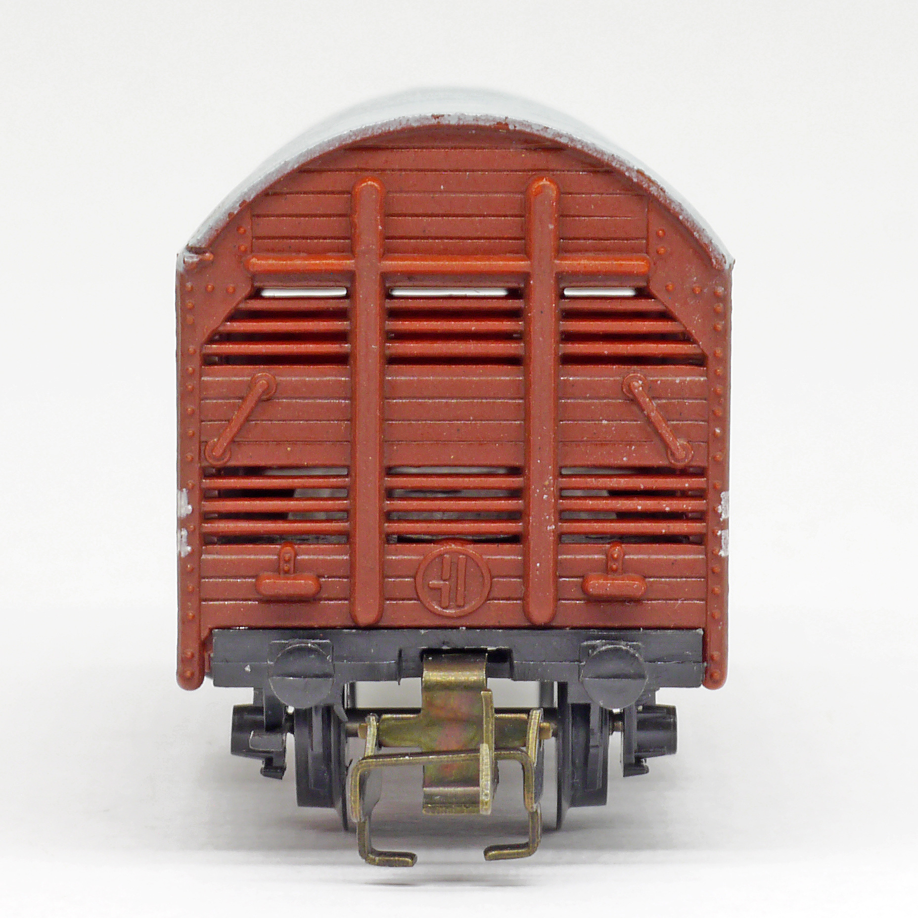| nákladní vůz na přepravu zvířat červenohnědý s šedou střechou |