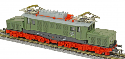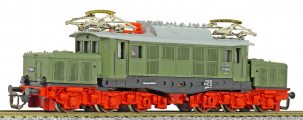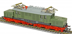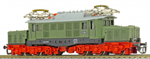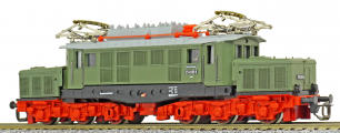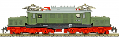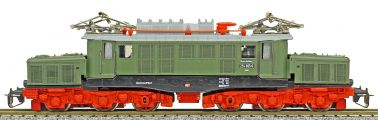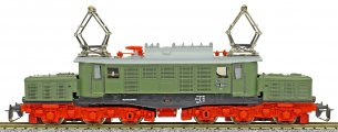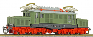 Popis   elektrická lokomotiva zelená s šedou střechou a červenými podvozky