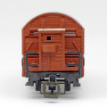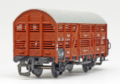 nákladní vůz na přepravu zvířat červenohnědý s šedou střechou a s brzdařskou budkou