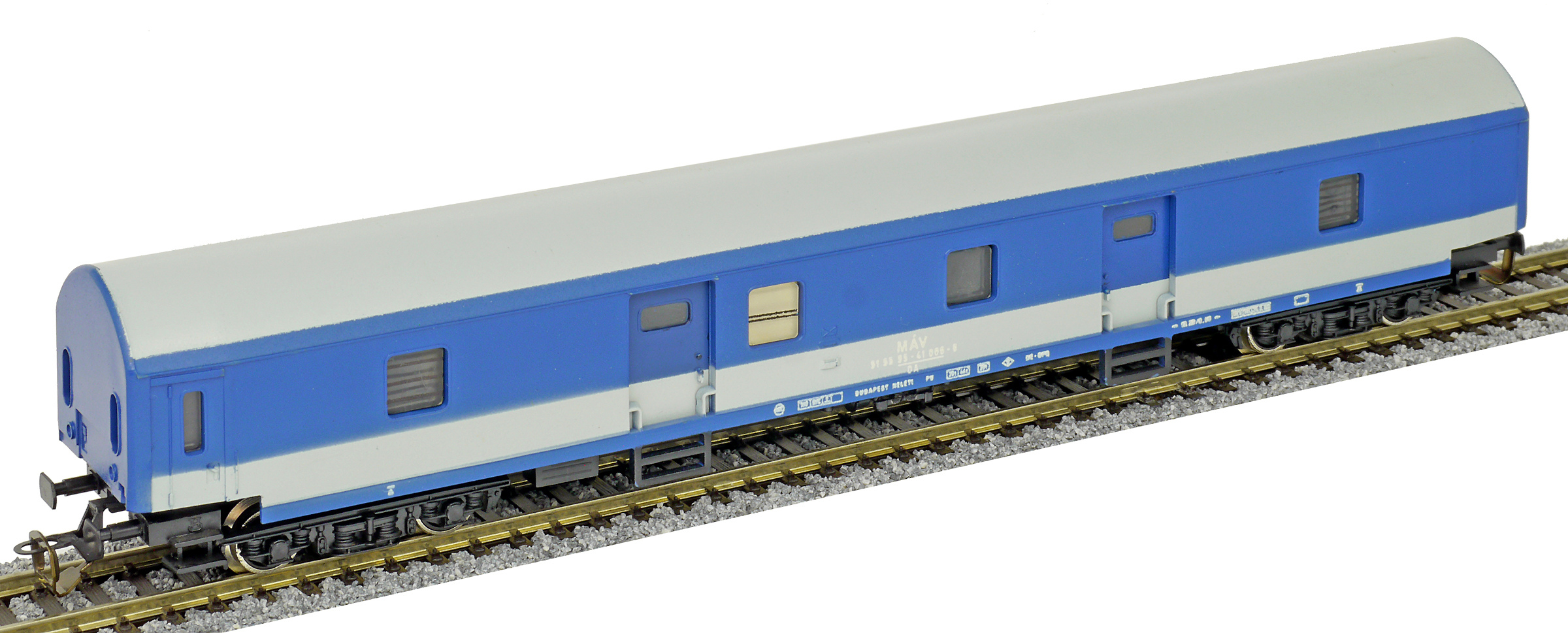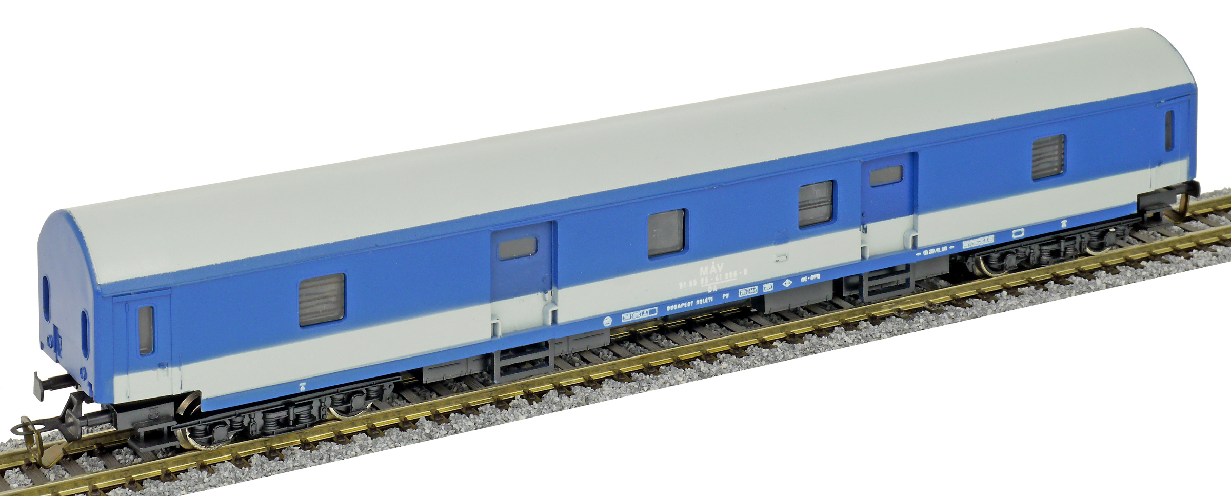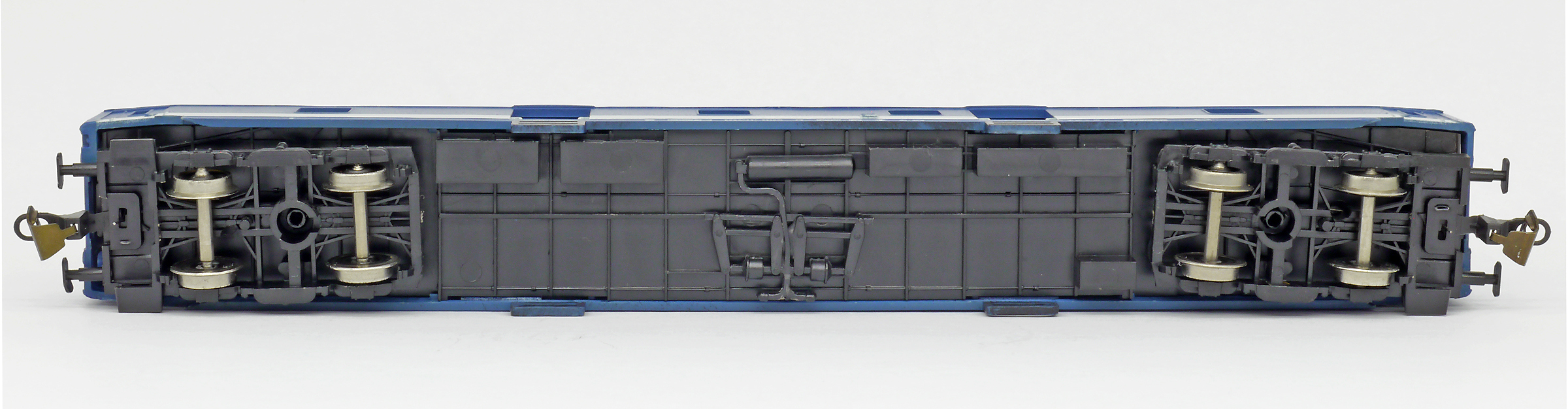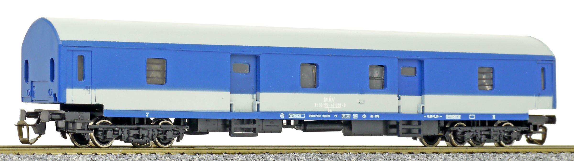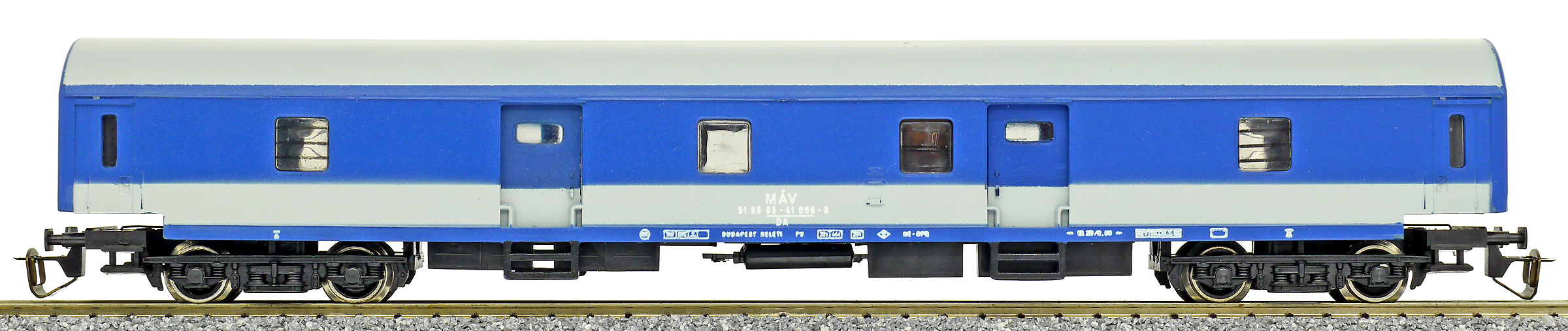 | poštovní vůz modrý s bílým pásem a s šedou střechou |