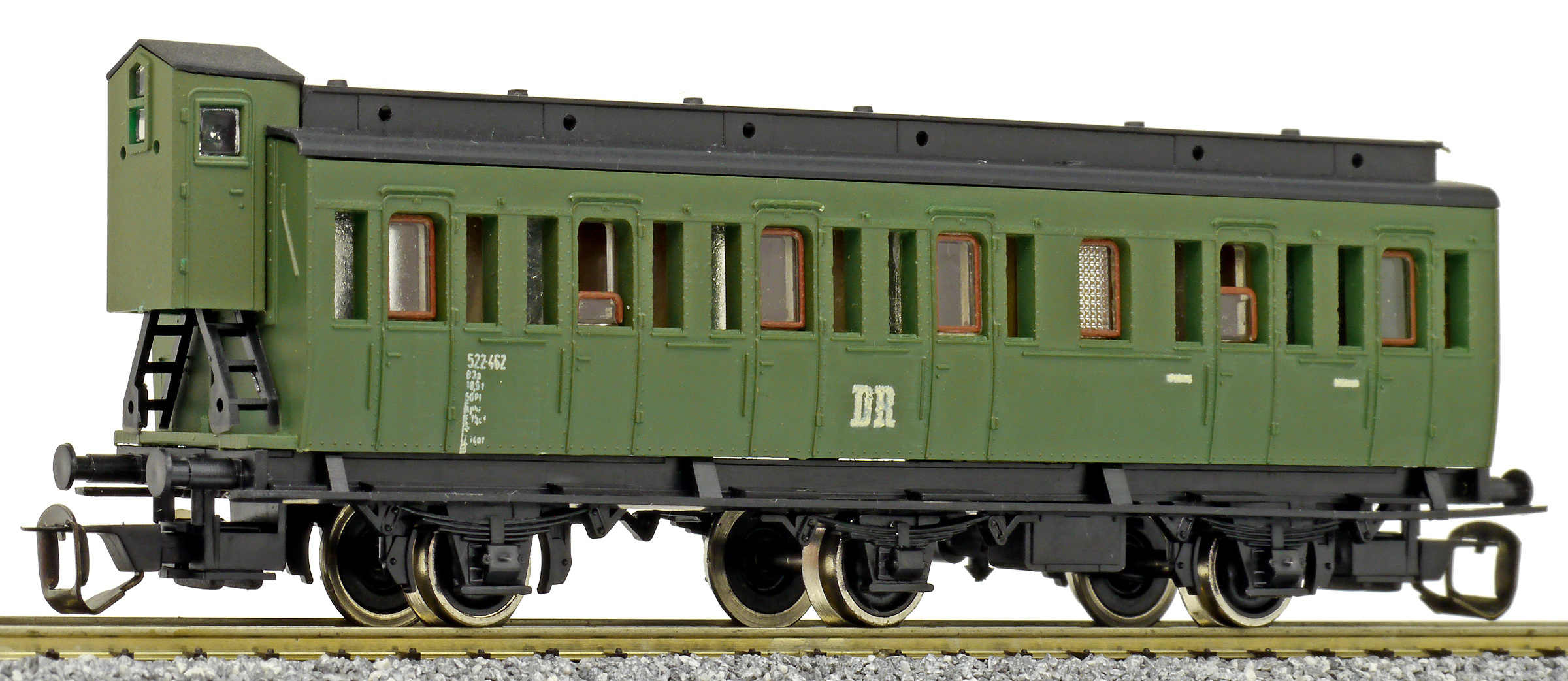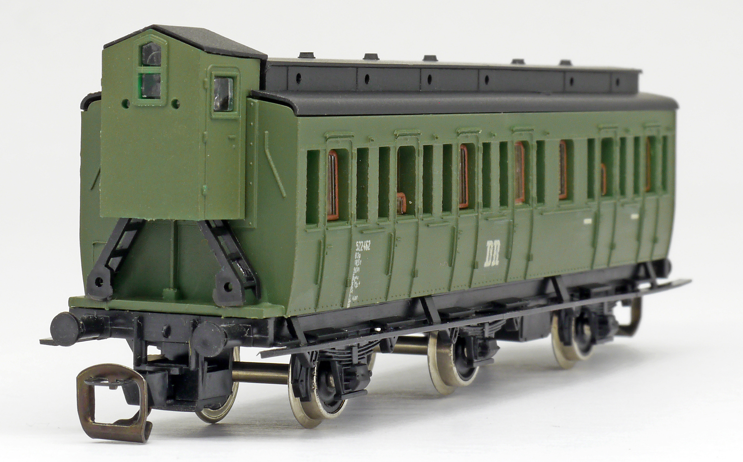 Popis   oddílový osobní vůz zelený s černou střechou a s brzdařskou budkou