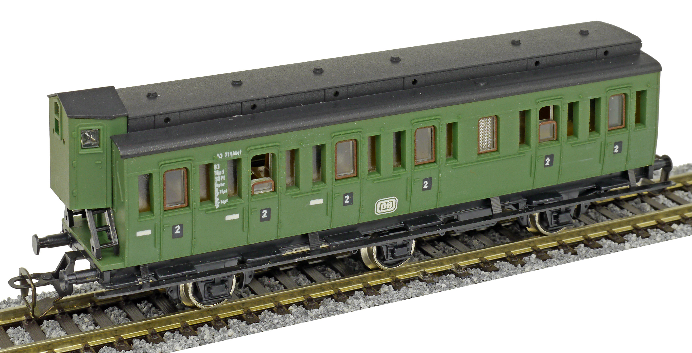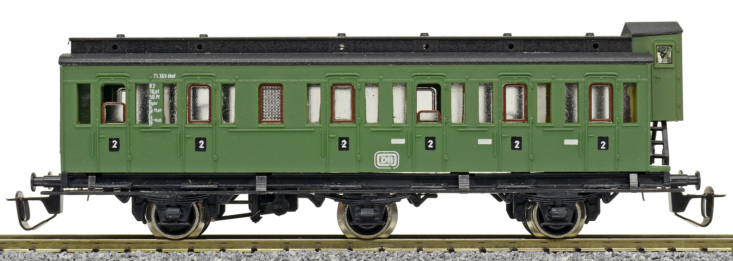 oddílový osobní vůz zelený s černou střechou s brzdařskou budkou 2. tř.