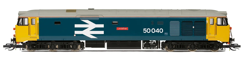 | dieselová lokomotiva modrá-žlutá, šedá střecha, černý pojezd „Leviathan“ |
