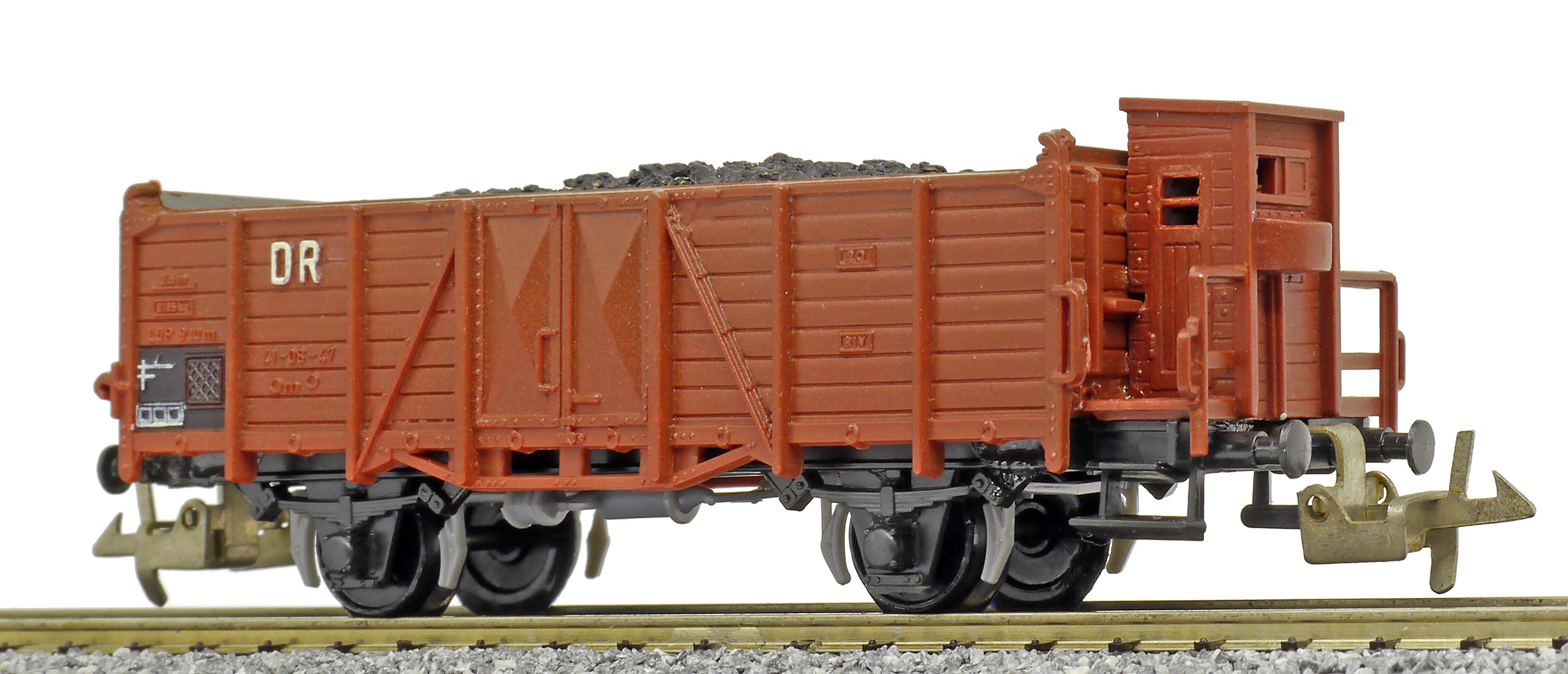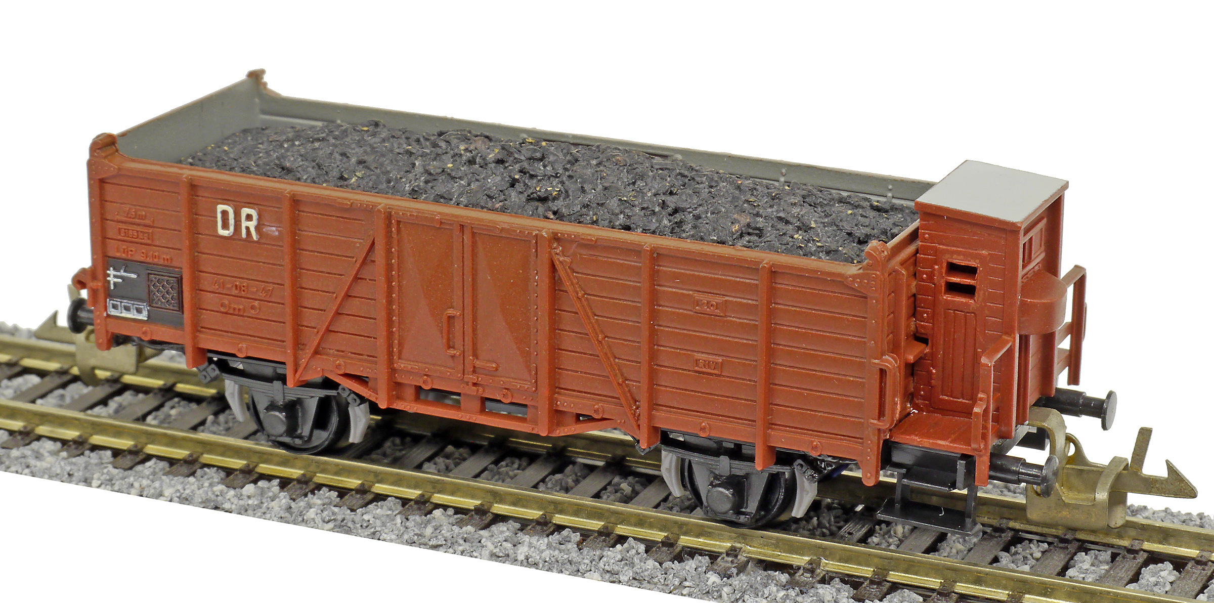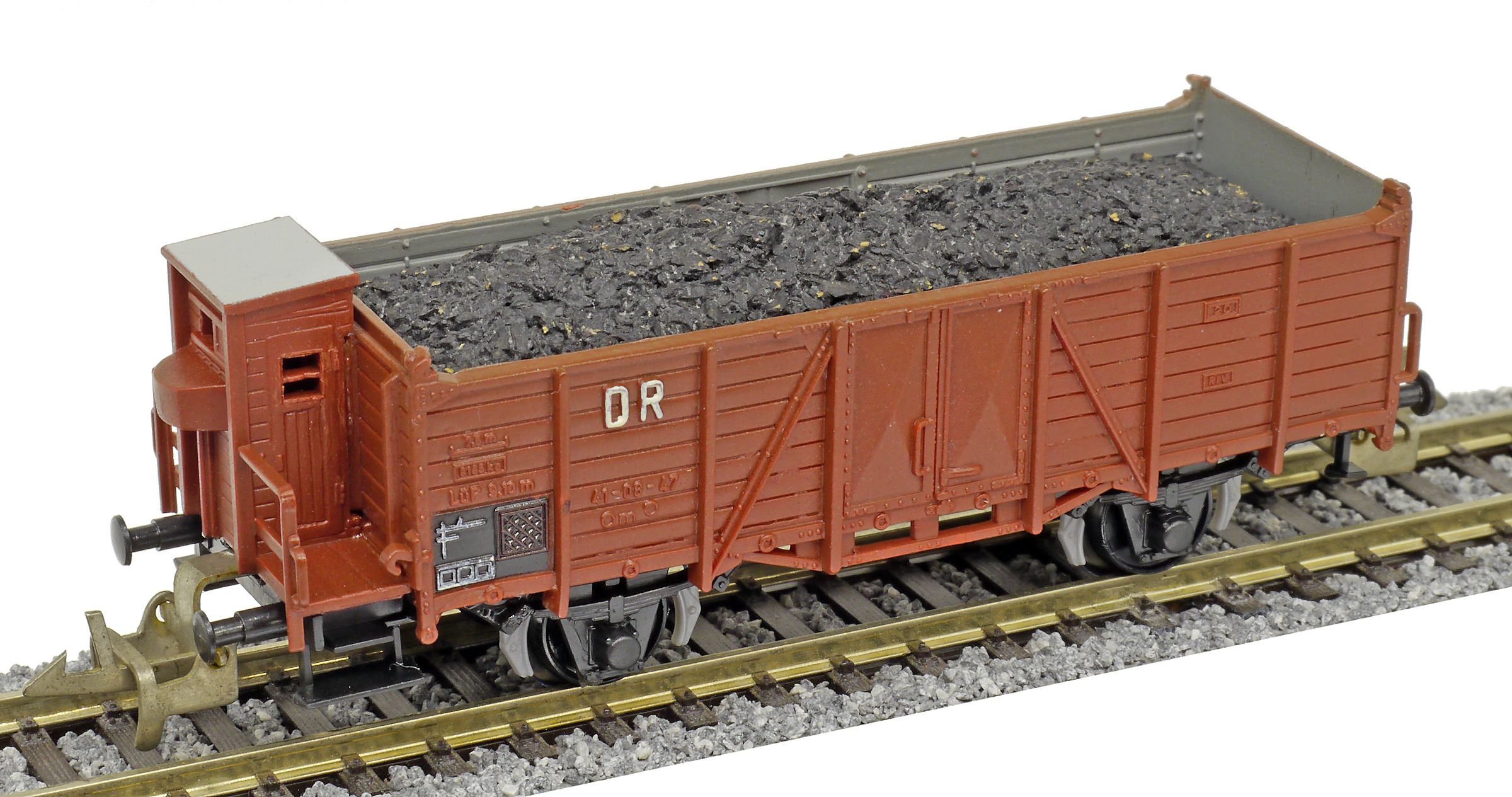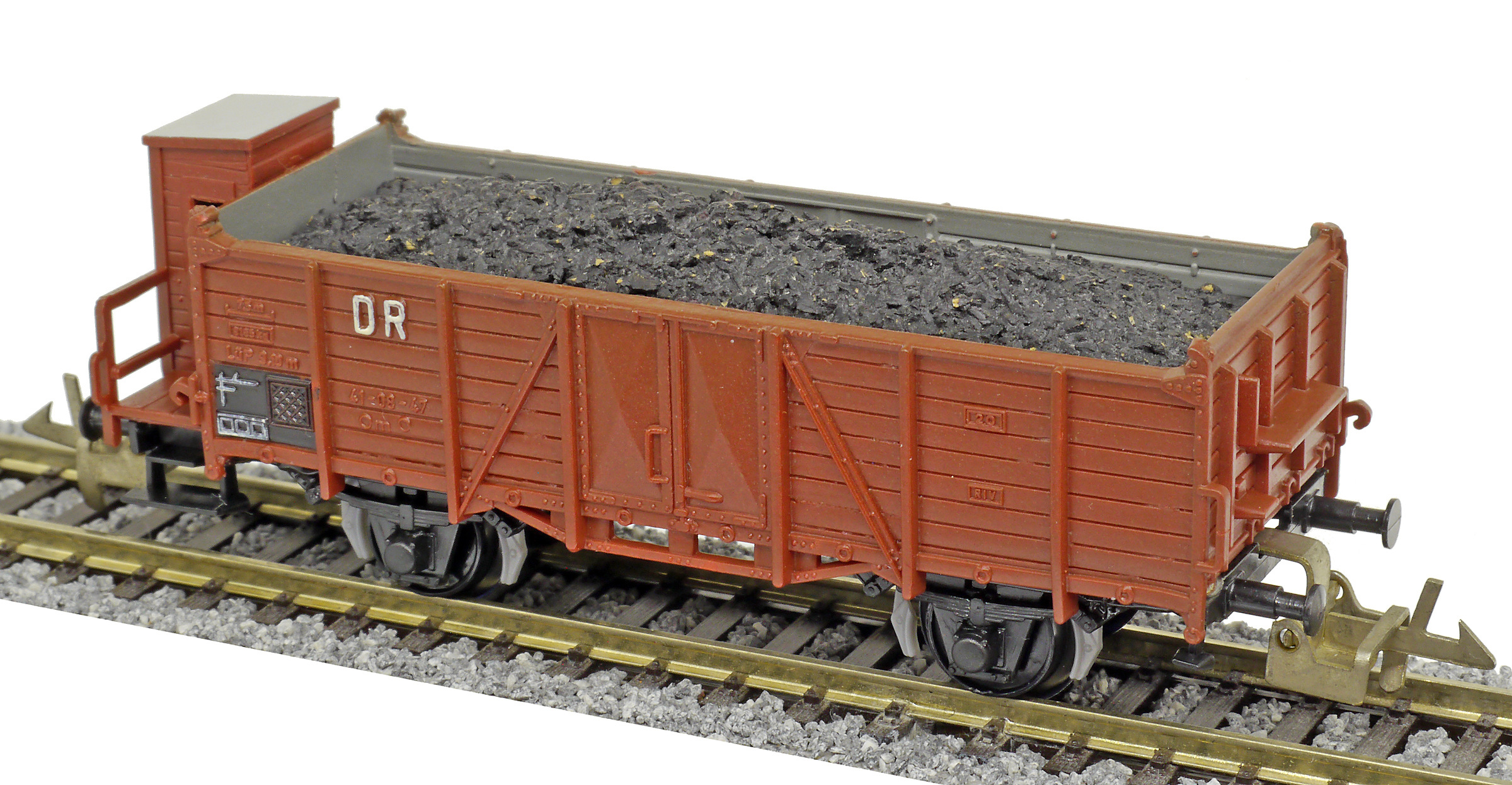 | otevřený nákladní vůz červenohnědý s brzdařskou budkou ložený uhlím |