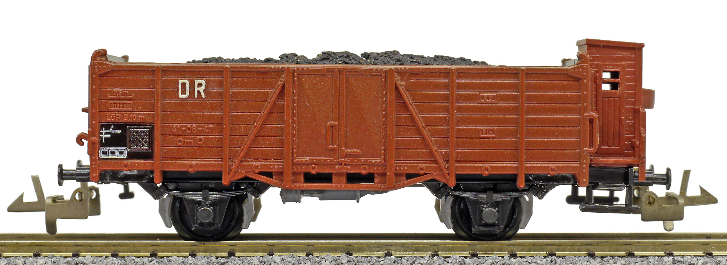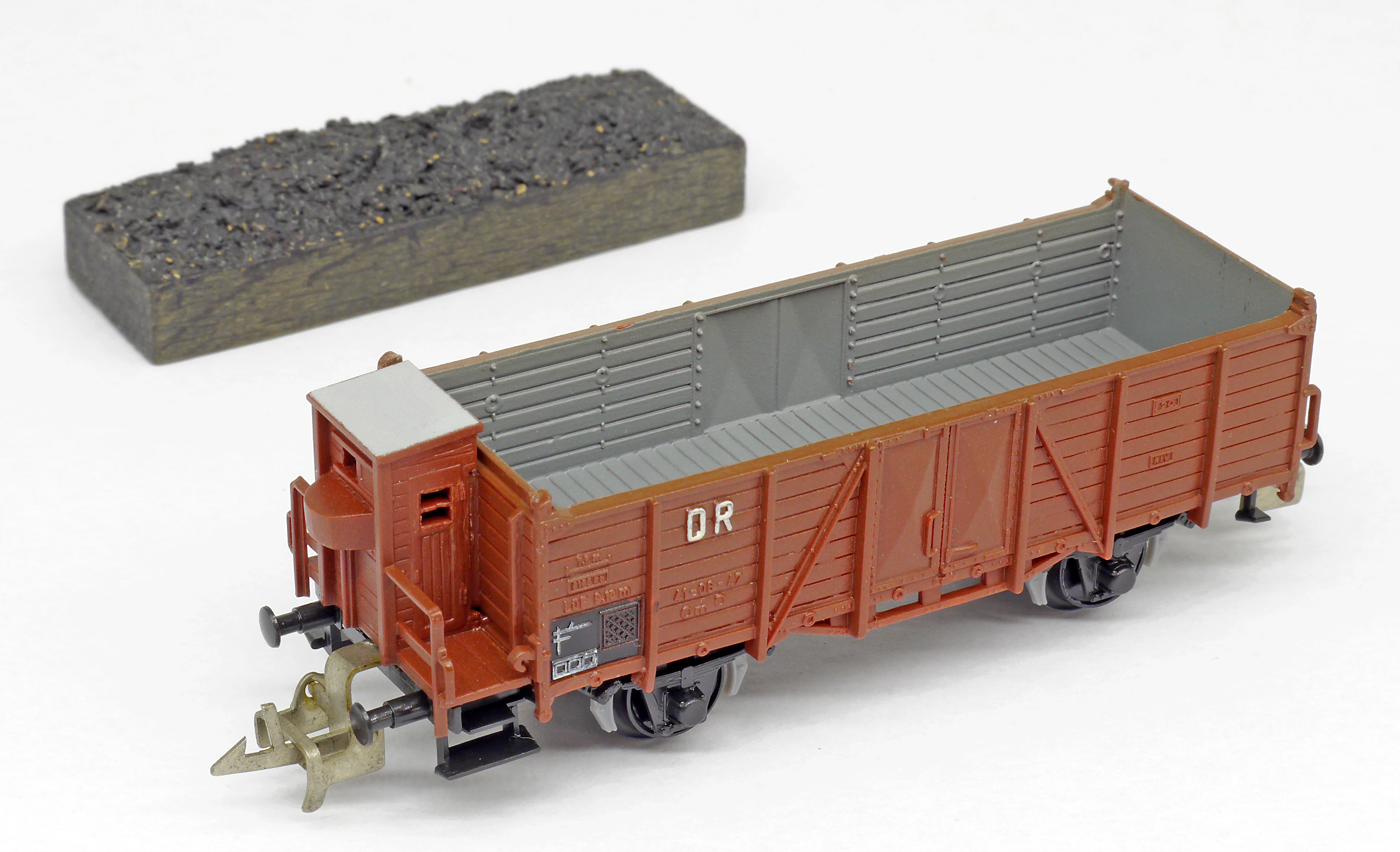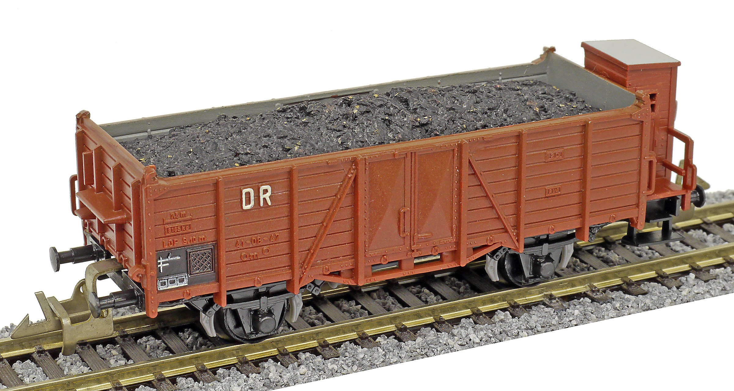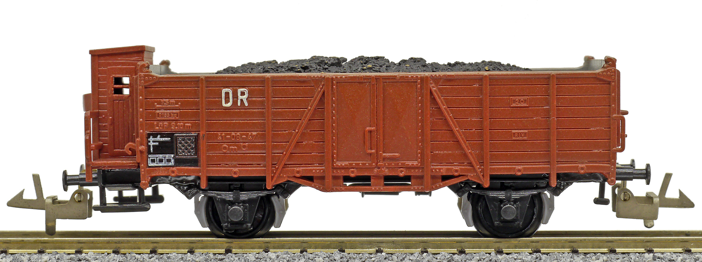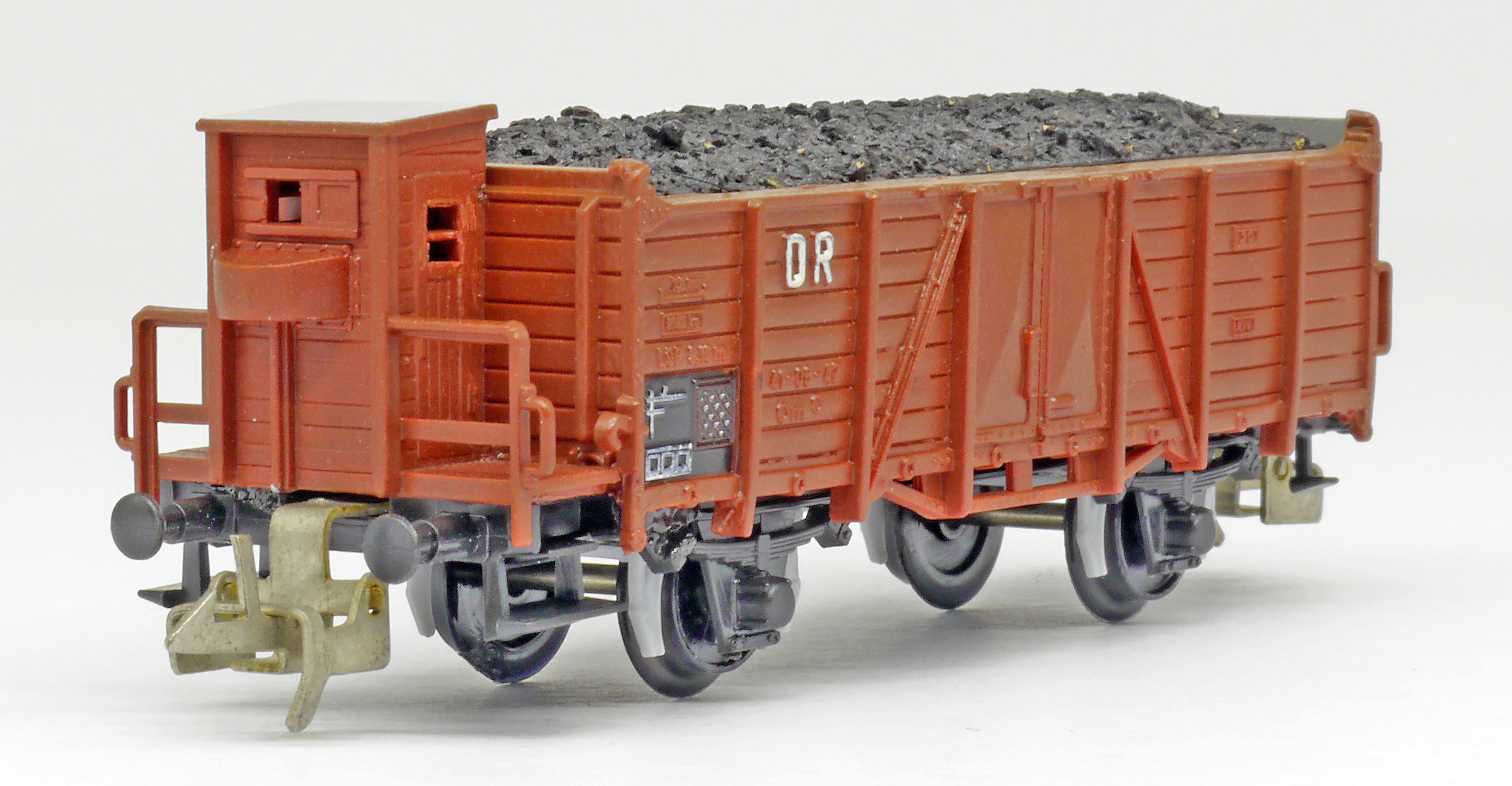| otevřený nákladní vůz červenohnědý s brzdařskou budkou ložený uhlím |