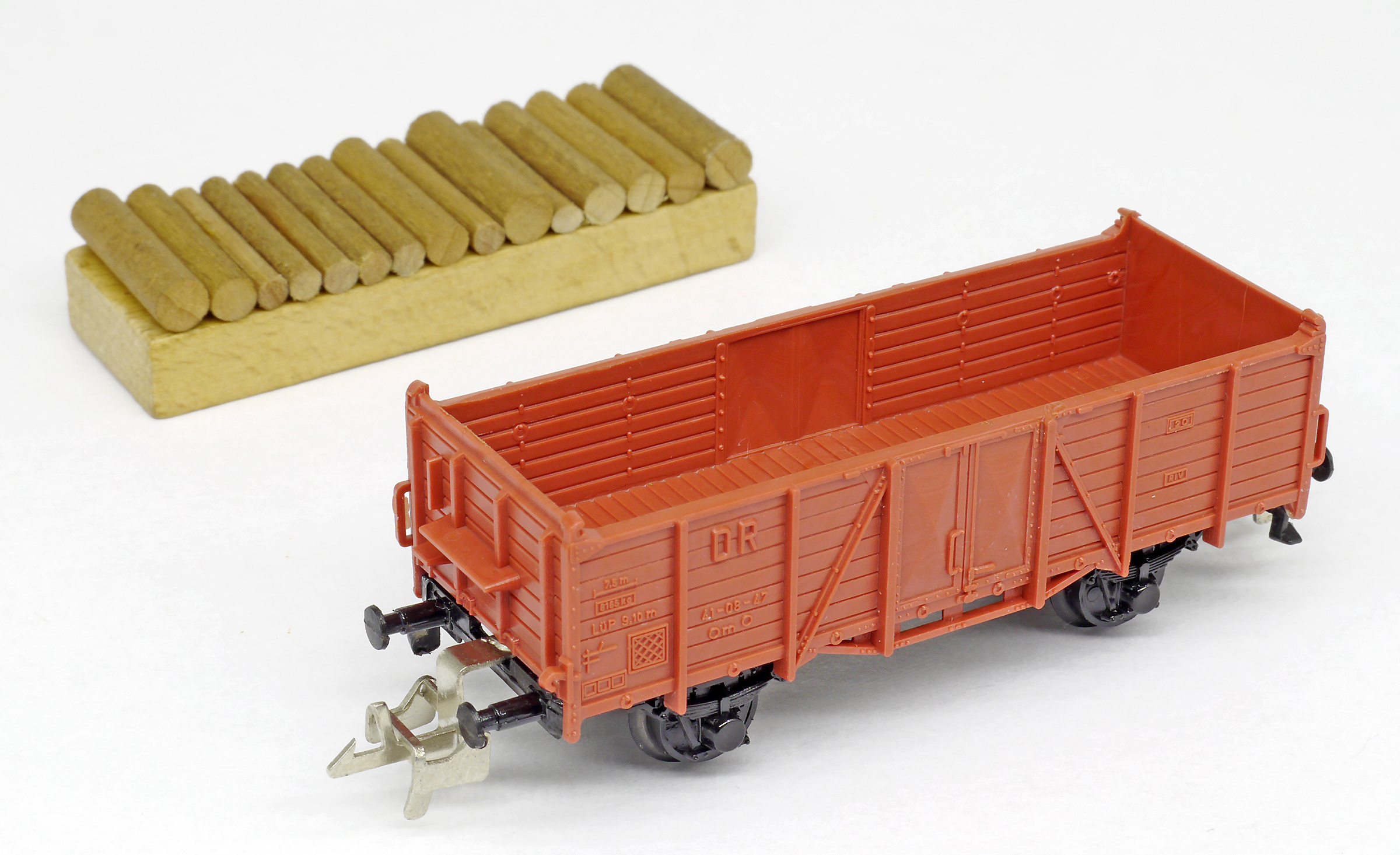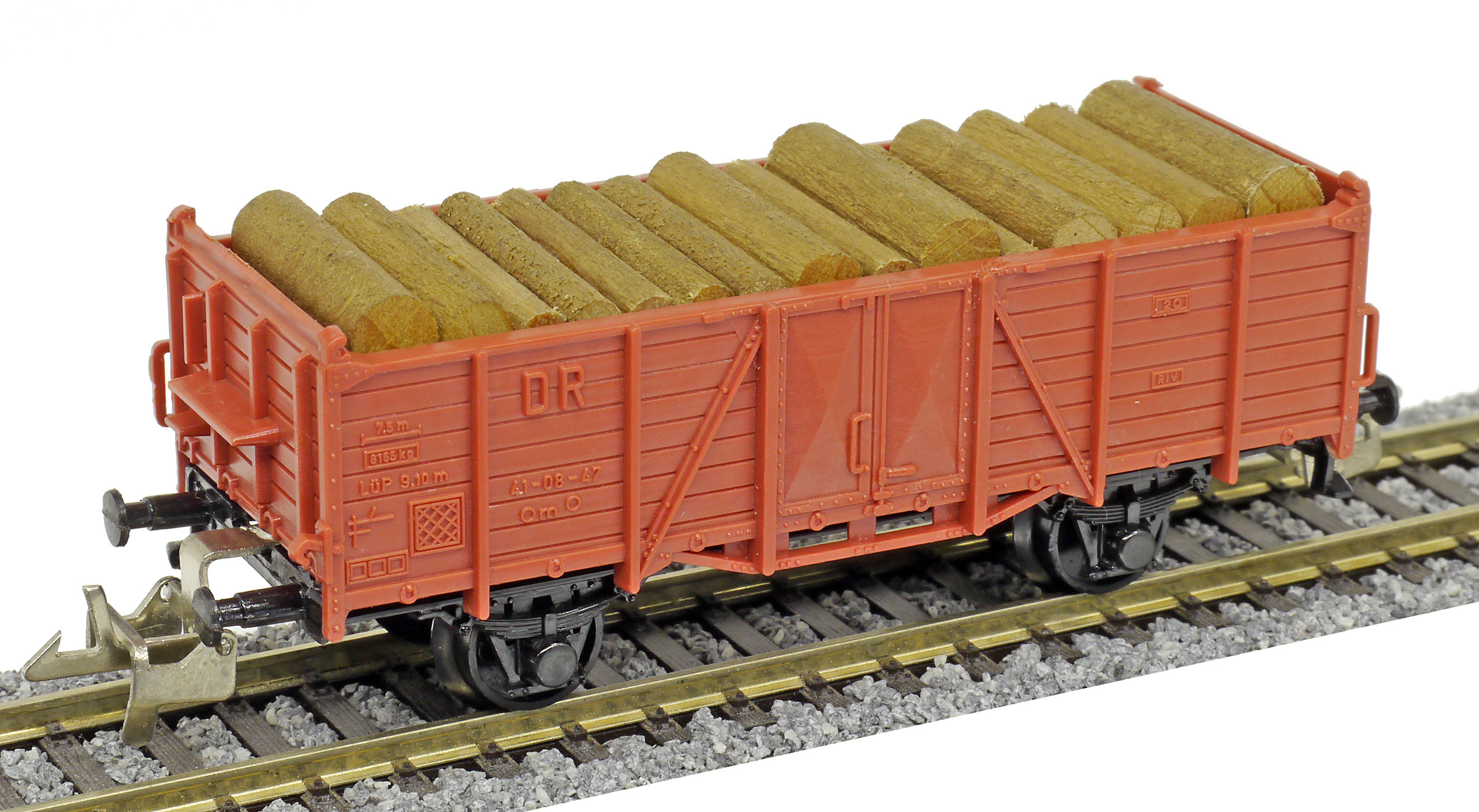 | otevřený nákladní vůz červenohnědý nebo zelený s nákladem kulatiny |