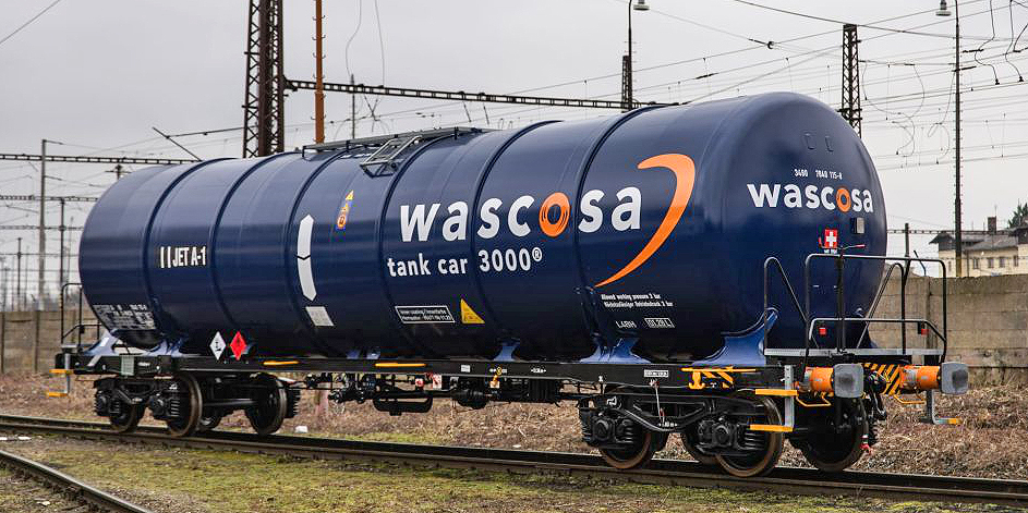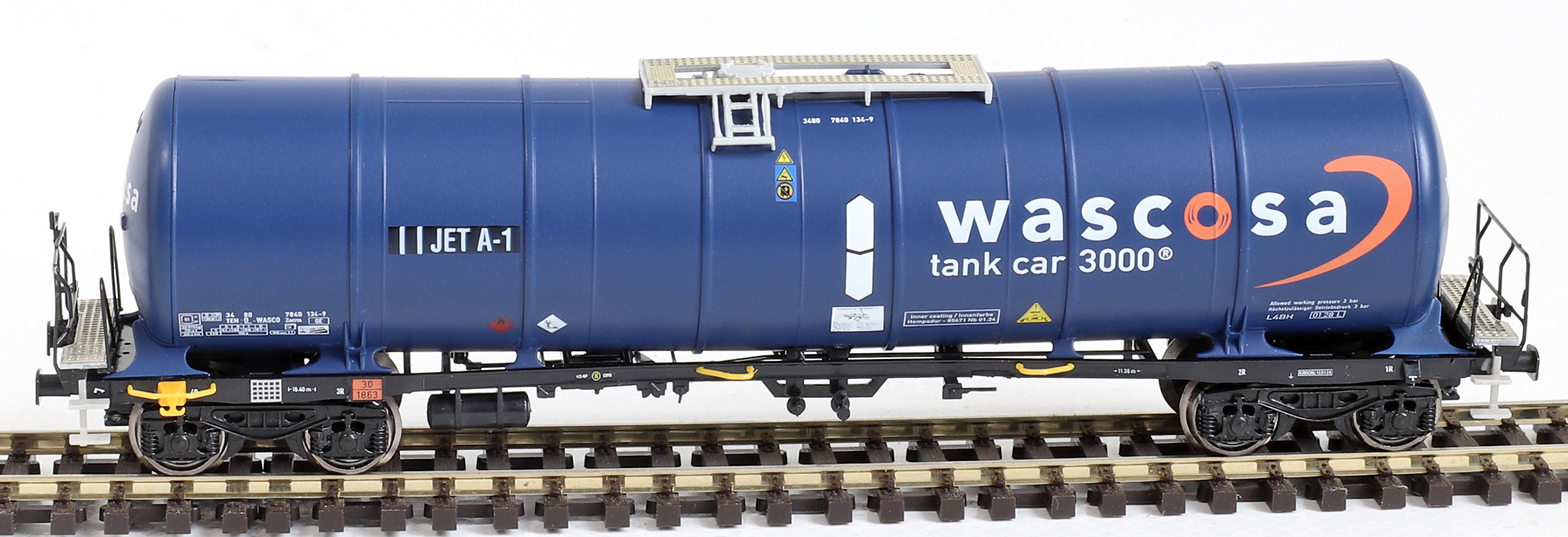 | kotlový vůz tmavě modrý se dvěma brzdařskými plošinami a s logem „wascosa“ |
