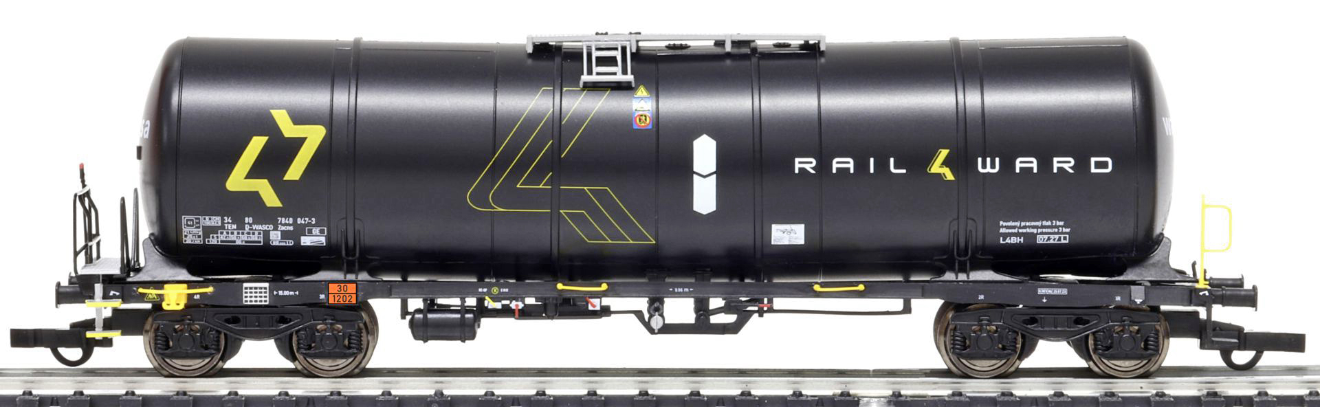 | set tří černých kotlových vozů s logem „RAIL4WARD“ |