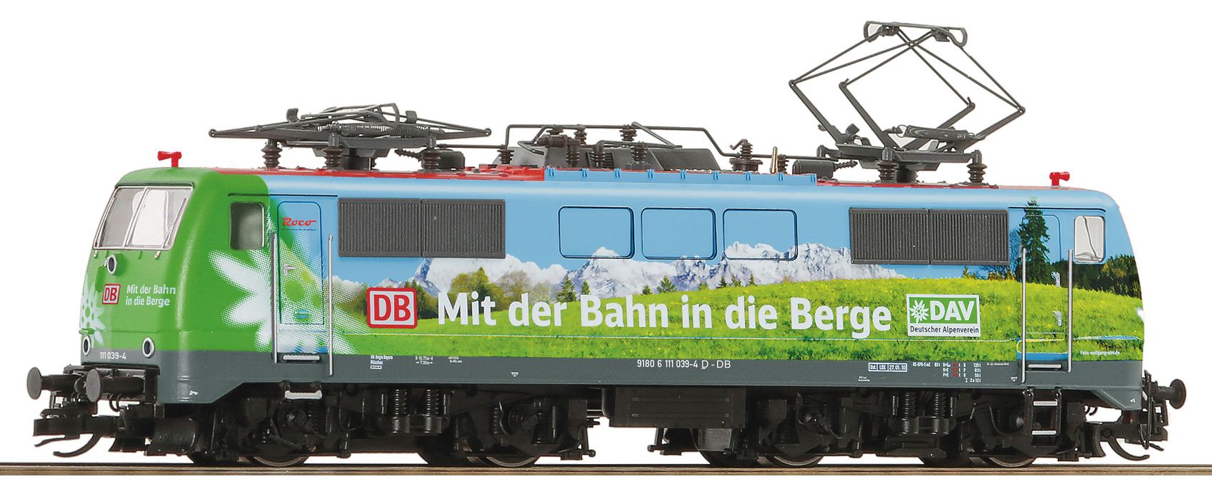 | elektrická lokomotiva s reklamním potiskem „Mit der Bahn in die Berge“ |