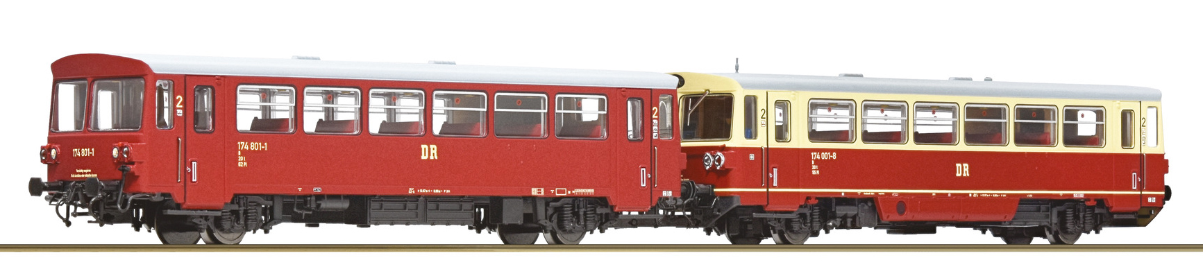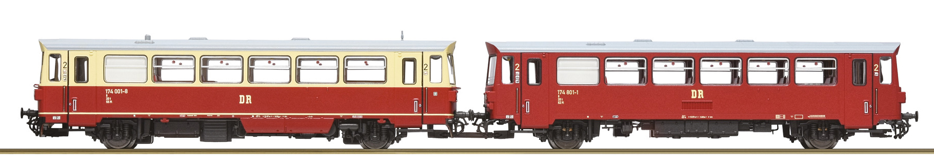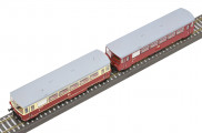 motorový vůz v barvě červený-slonová kost s šedou střechou s přípojným vozem v červené barvě s šedou střechou