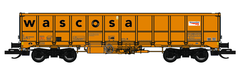 | vysokostěnný nákladní vůz oranžový s logem „Wascosa/Network Rail“ |