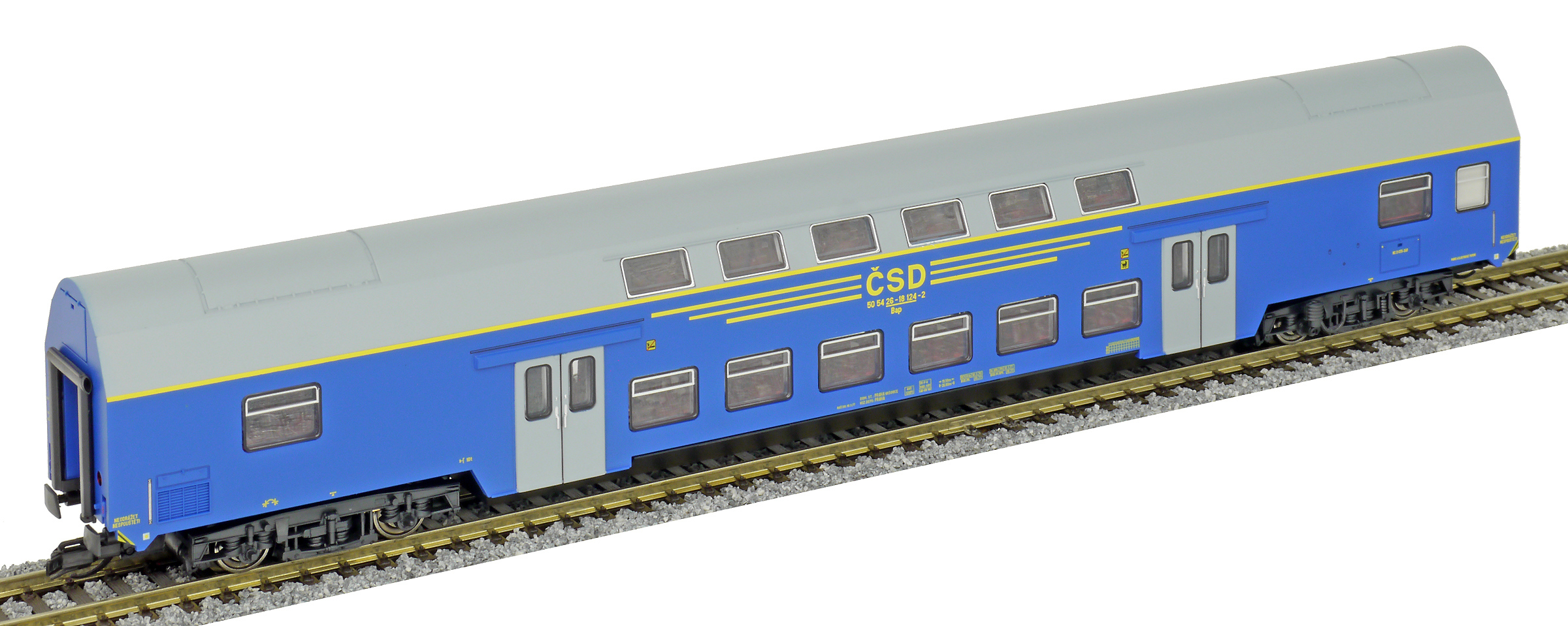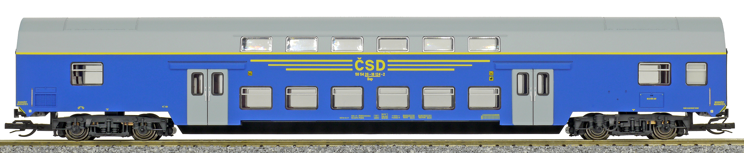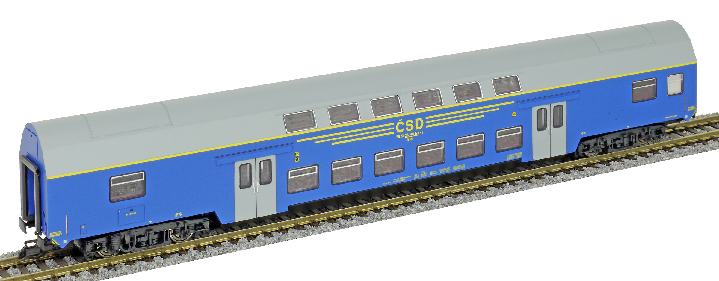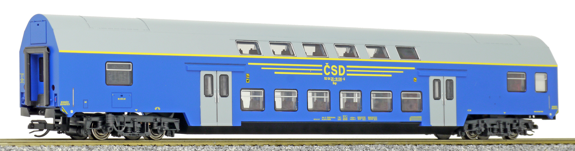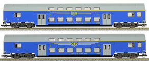 | set dvou patrových vozů v barvě modré, šedá střecha a dveře |