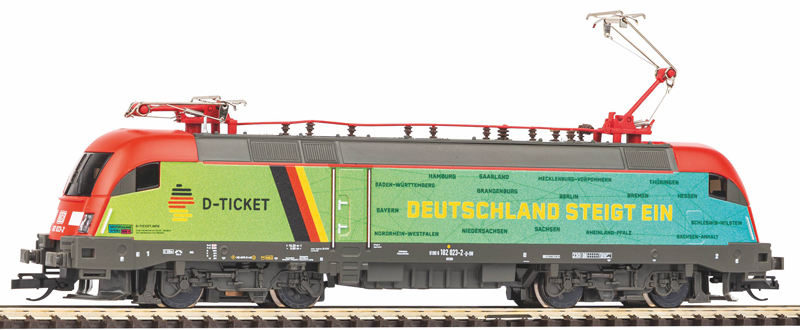 | elektrická lokomotiva zelená-červená s reklamním potiskem „D-Ticket“ |