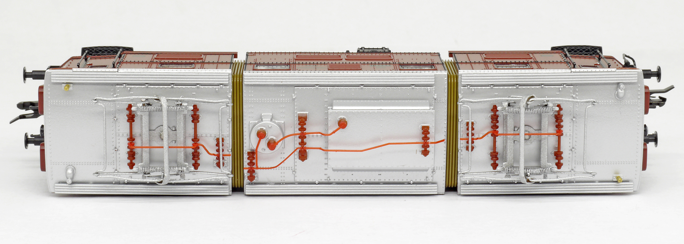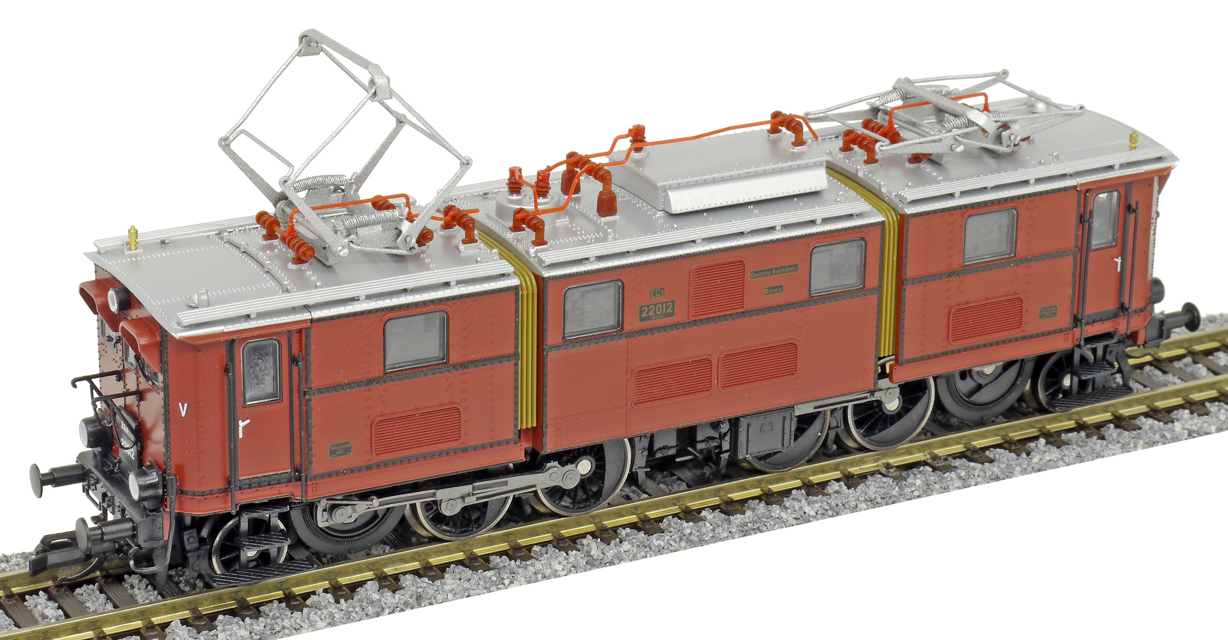 | elektrická lokomotiva hnědá se stříbřitou střechou |
