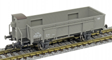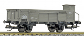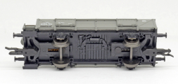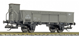 | otevřený nákladní vůz zeleno šedý s brzdařskou budkou |