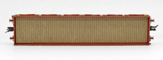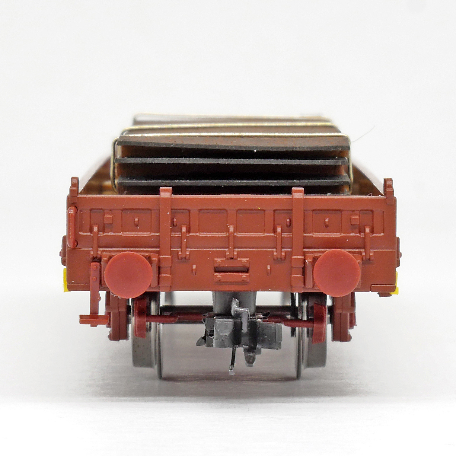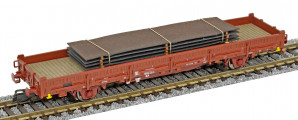 | nízkostěnný nákladní vůz červenohnědý s klanicemi s nákladem ocelových plechů |