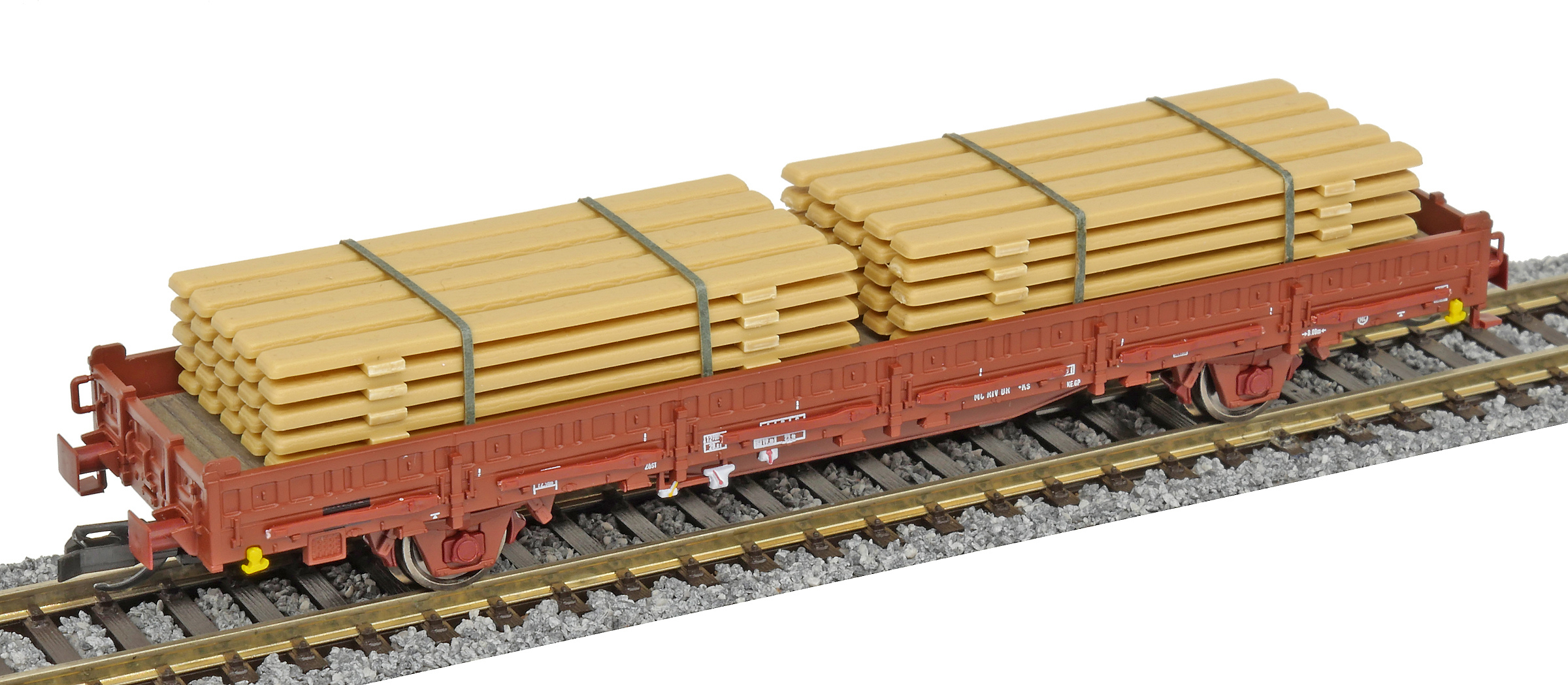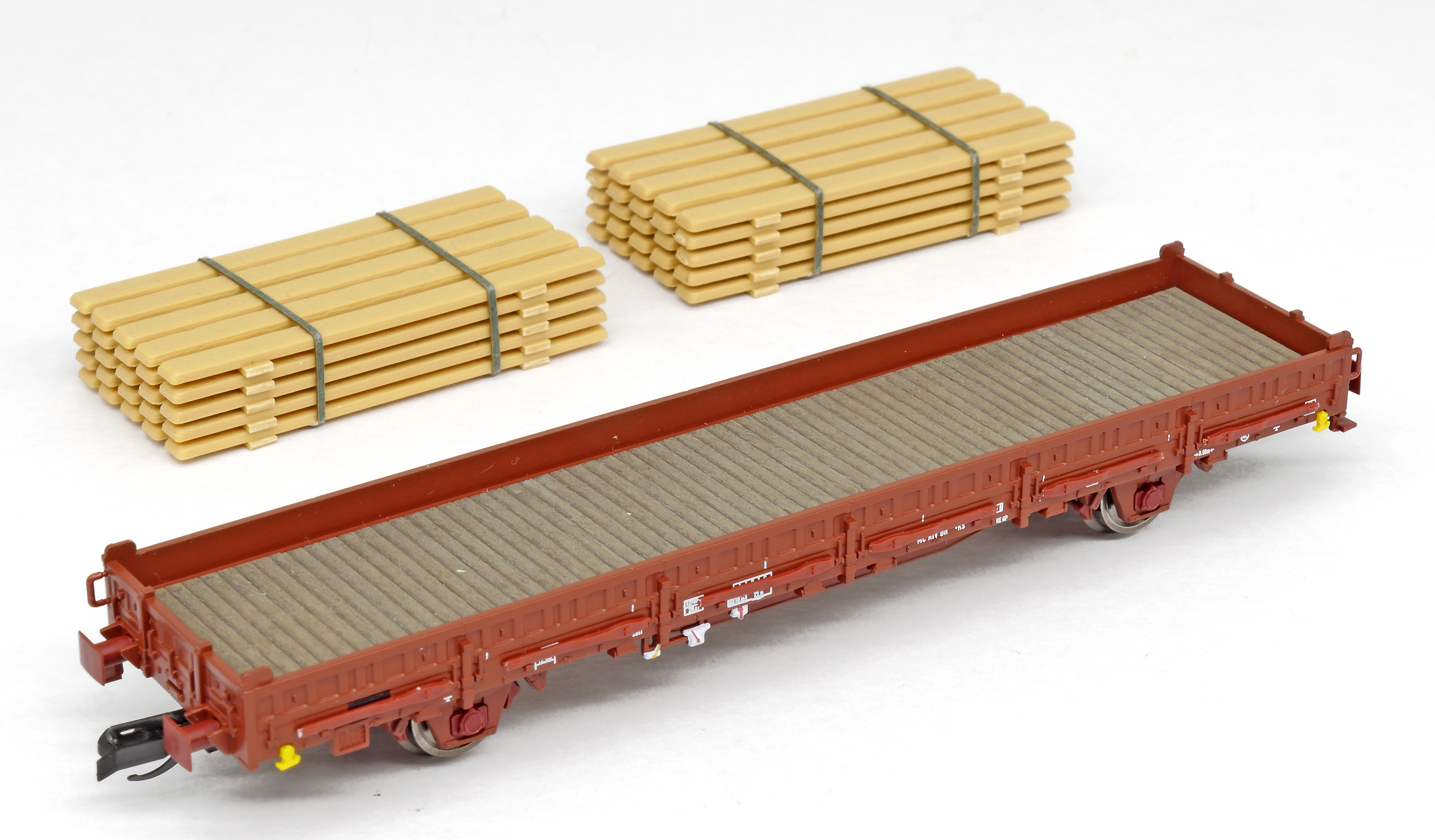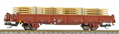 | nízkostěnný nákladní vůz červenohnědý s klanicemi s nákladem stohů desek |