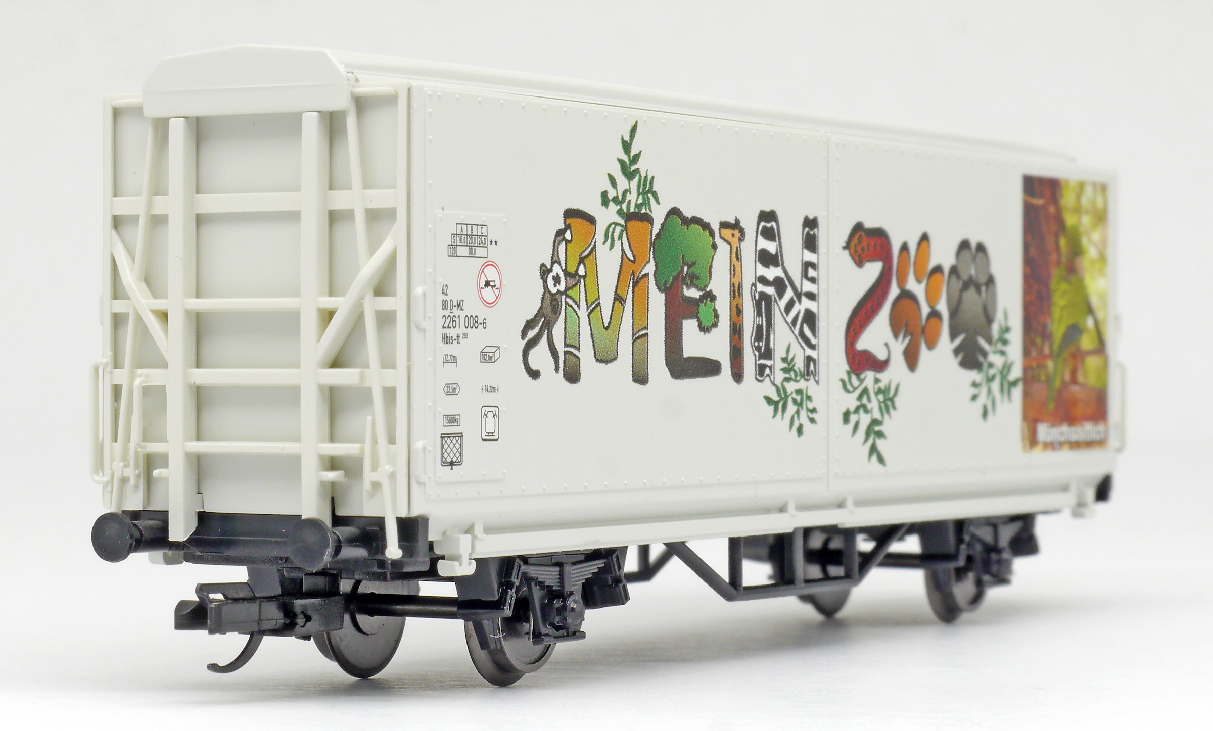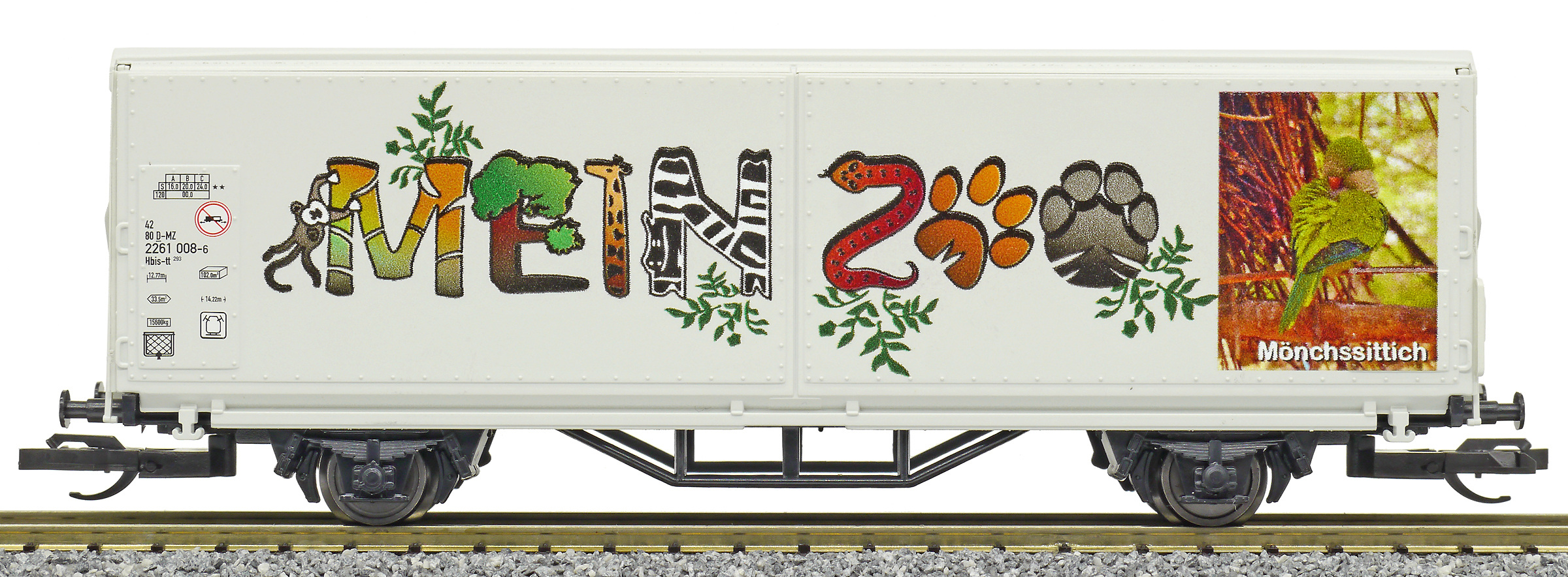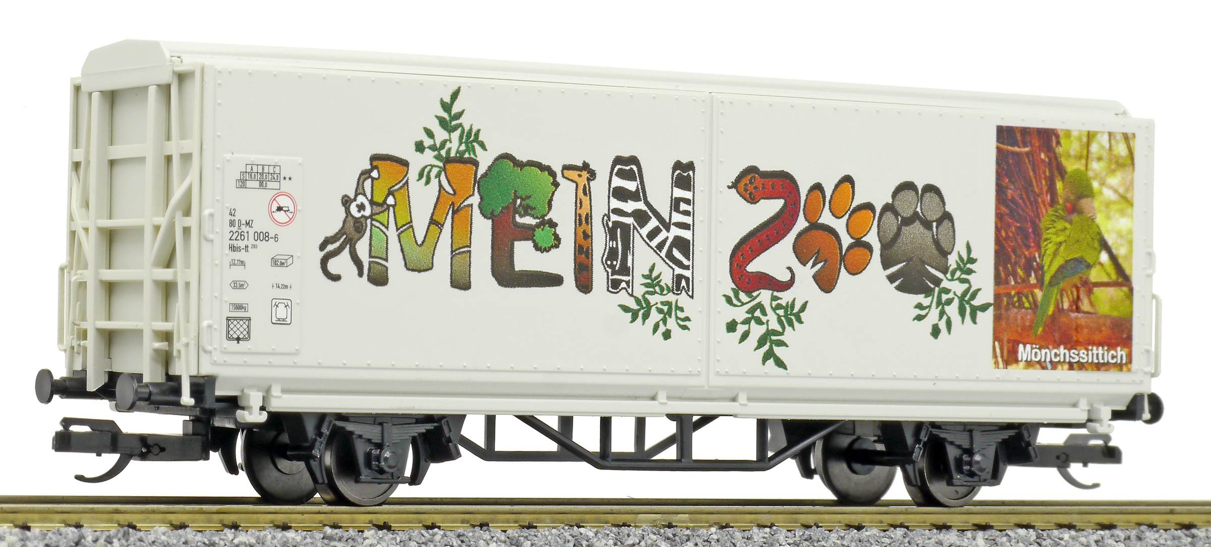 | krytý nákladní vůz s posuvnými stěnami a s reklamním potiskem „Mein Zoo” |