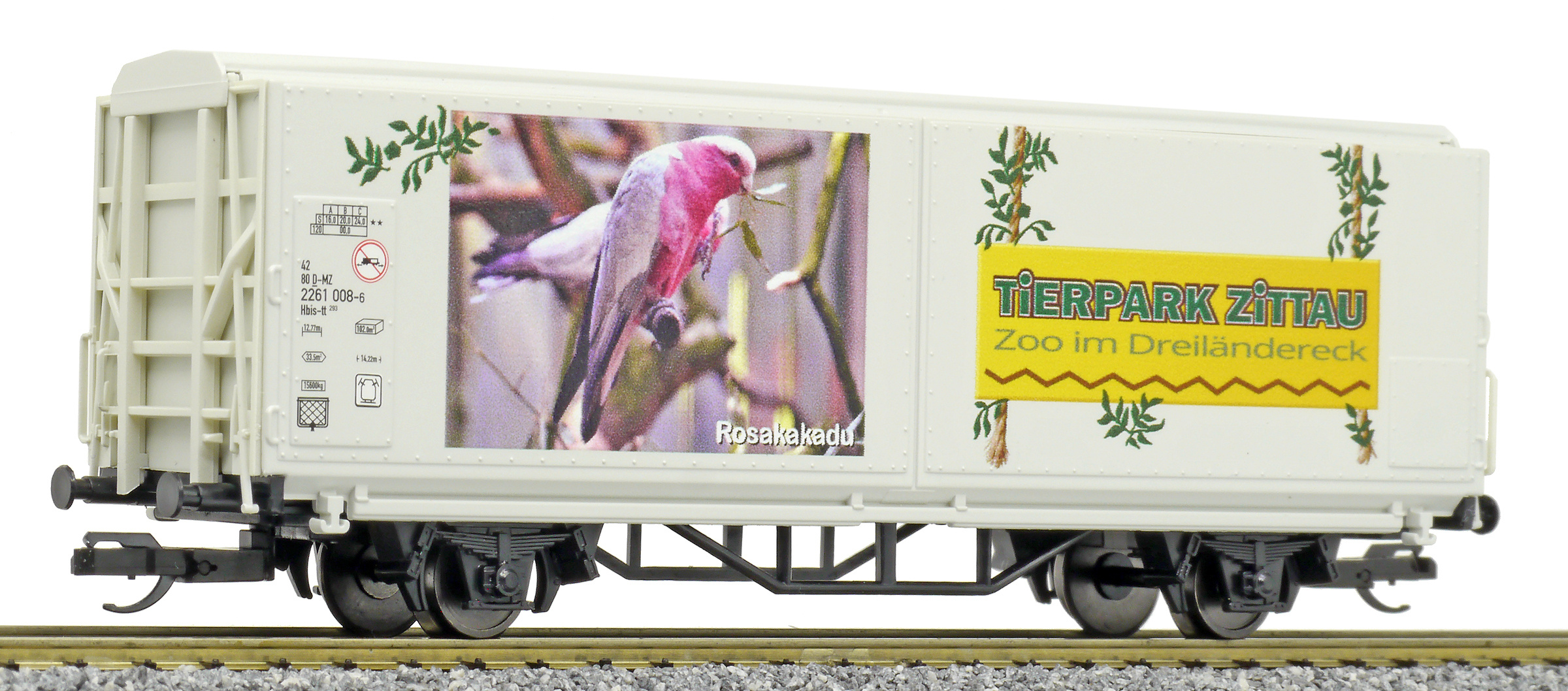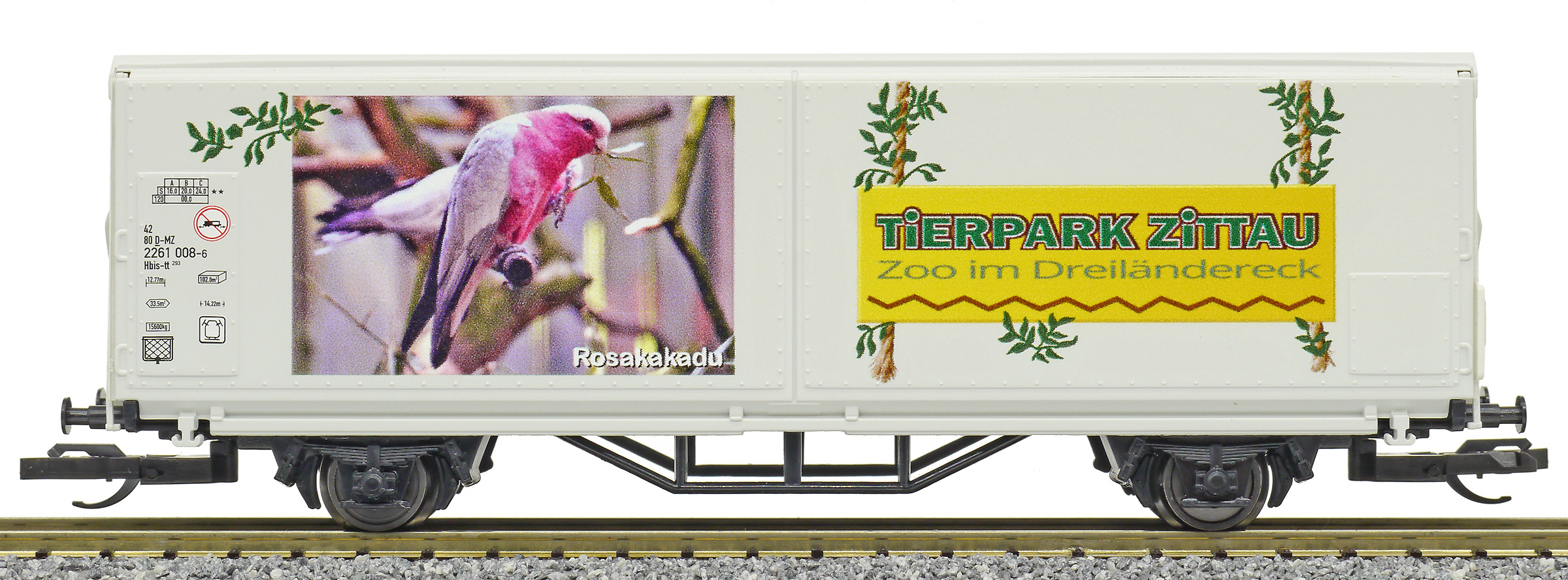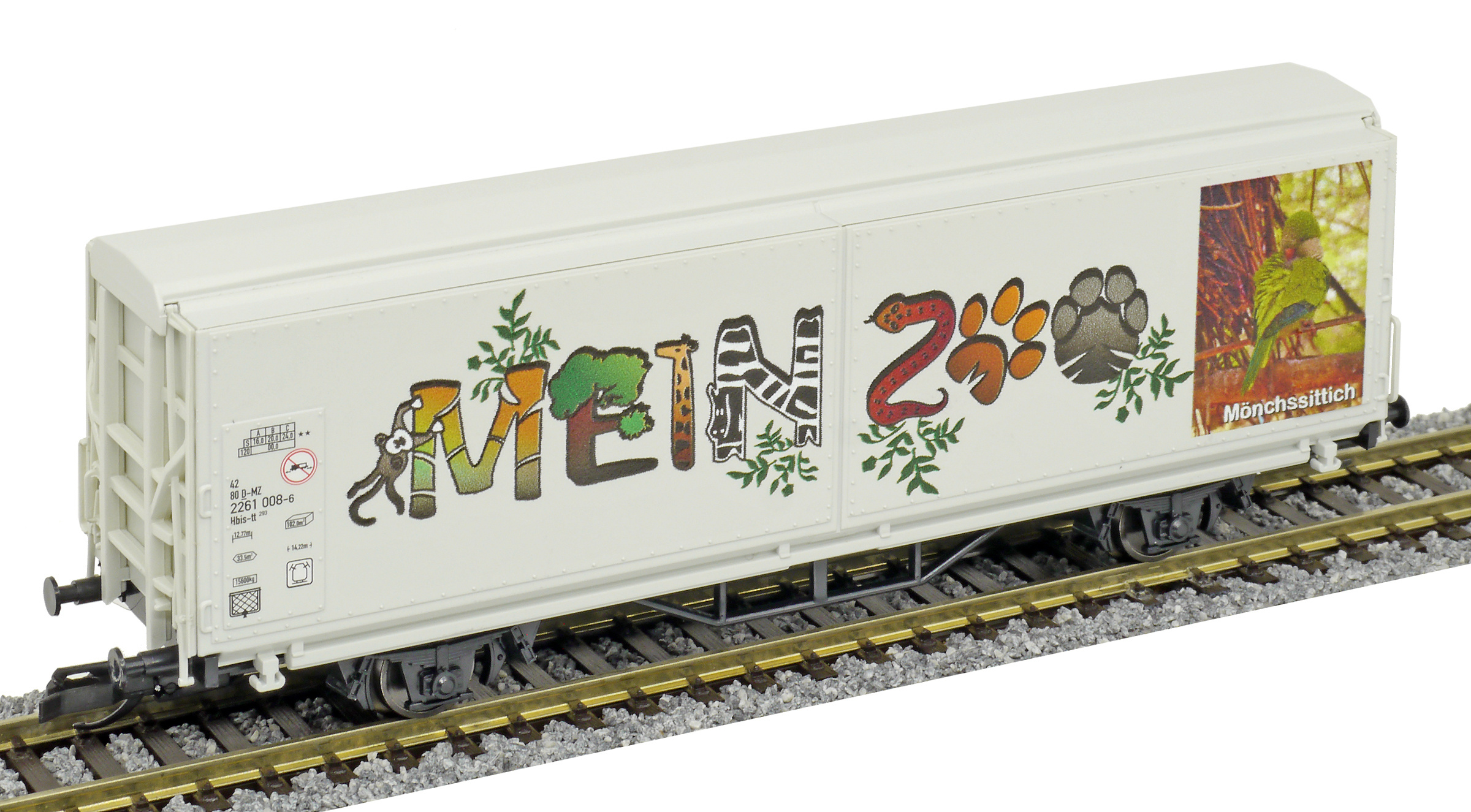 | krytý nákladní vůz s posuvnými stěnami a s reklamním potiskem „Mein Zoo” |