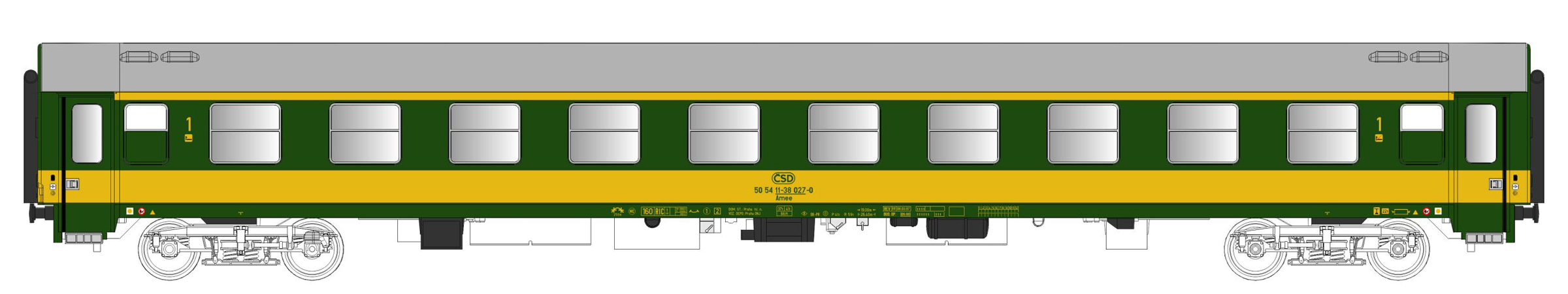 | rychlíkový vůz zelený se žlutým pruhem a šedou střechou 1. tř. |