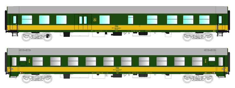 | rychlíkový vůz zelený se žlutým pruhem a šedou střechou se zavazadlovým oddílem 2. tř. |