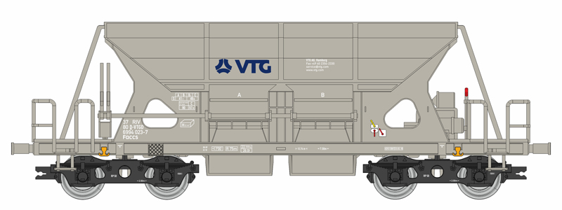 | nákladní samovýsypný vůz šedý s logem „VTG“ |
