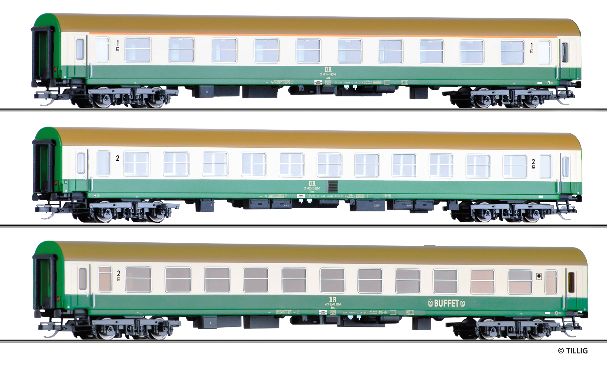 | Reisezugwagenset der DR, bestehend aus einem Reisezugwagen 1. Klasse, Bauart Halberstadt, einem Reis |