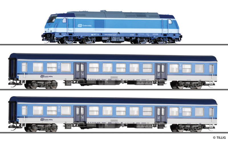 | set dieselové lokomotivy „TRAXX“ a dvou rychlíkových vozů 2. tř. |