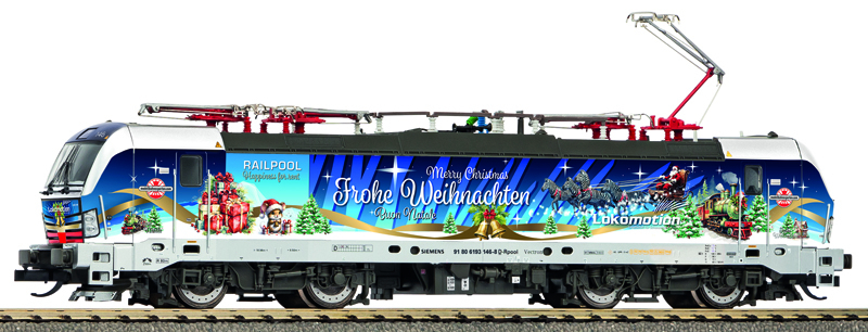 | elektrická lokomotiva s reklamním potiskem „Frohe Weihnachten“ |