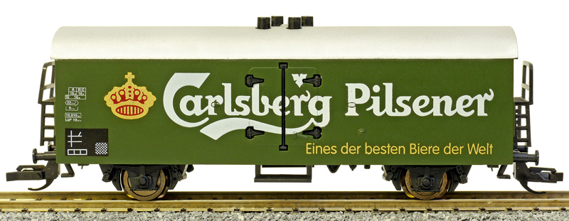| nákladní chladící vůz zelený se stříbrnou střechou „Carlsberg Pilsener“ |