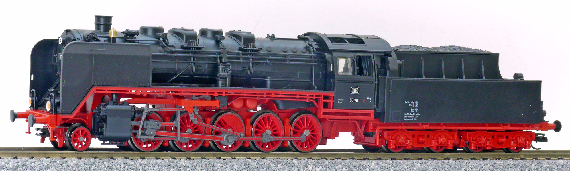 Kód   125002  [Lokomotivy] → [Parní] → [BR 50] → 125002: černá s červeným pojezdem a kouřovými plechy, tendr nové konstrukce