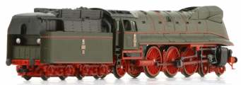| parní lokomotiva částečně kapotovaná tmavě zelená s červeným pojezdem |